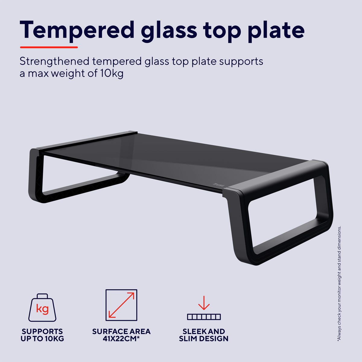 Stativ i härdat glas för skärm eller bärbar dator. Max belasning 10 kg. Mått: 415x225x98 mm.