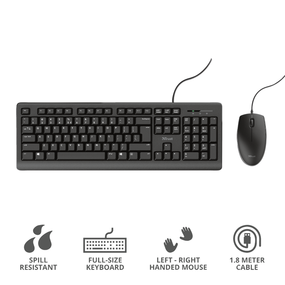Kabelanslutet mus- och tangentbordskit som är utformat för bekvämt arbete. Tysta tangenter och musknappar som inte stör familjen eller kollegorna. Spilltåligt tangentbord i full storlek för optimal effektivitet och produktivitet. Musen passar både vänster- och högerhänta användare. Båda enheterna ansluts via USB-uttag.