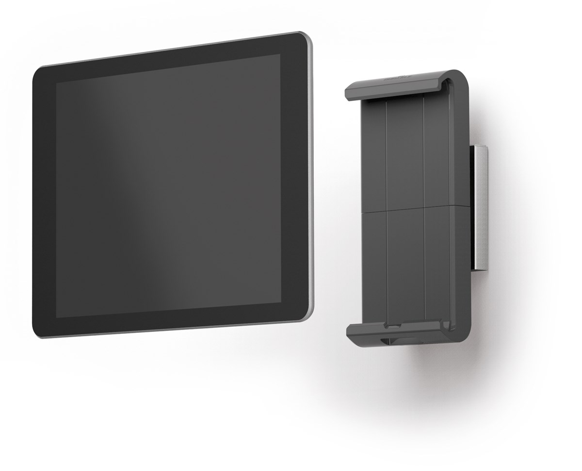 Väggmonterad hållare för surfplattor för användning i informationssyfte på t ex mässor, i butiker samt försäljnings- och utställningslokaler. Väggnära och enkel montering. Passar surfplattor från 7" till 13" / 160 mm till 275 mm. Surfplattan är enkel att sätta i och ta ur hållaren, som låses med nyckel. Vridbar 360° för användning i både stående och liggande format, med stopplägen vid varje 90°. Laddningskabeln ansluts genom en öppning i hållaren. Material: aluminium, ABS-plast. Mått: 85 x 50 x 180 mm (B x H x D).