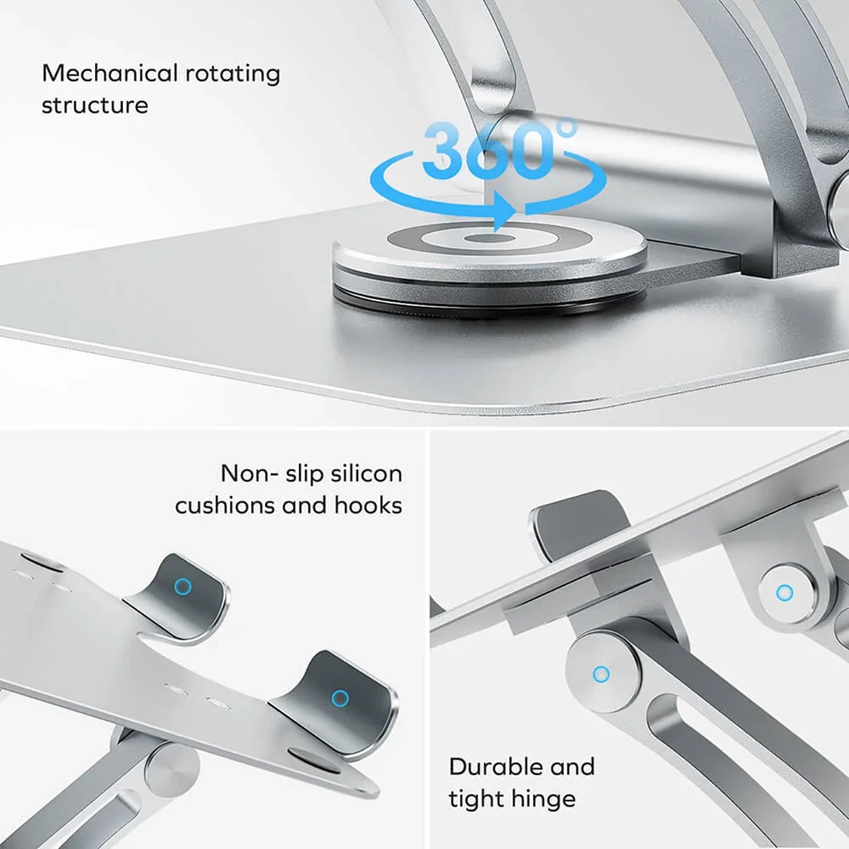 360 rotation 0-30 cm höjdjustering Stöder de flesta bärbara datorer från 10" - 17,3" Överlägsen viktbärande belastning på upp till 6 kg Taktila halkfria gummikuddar håller datorn på plats