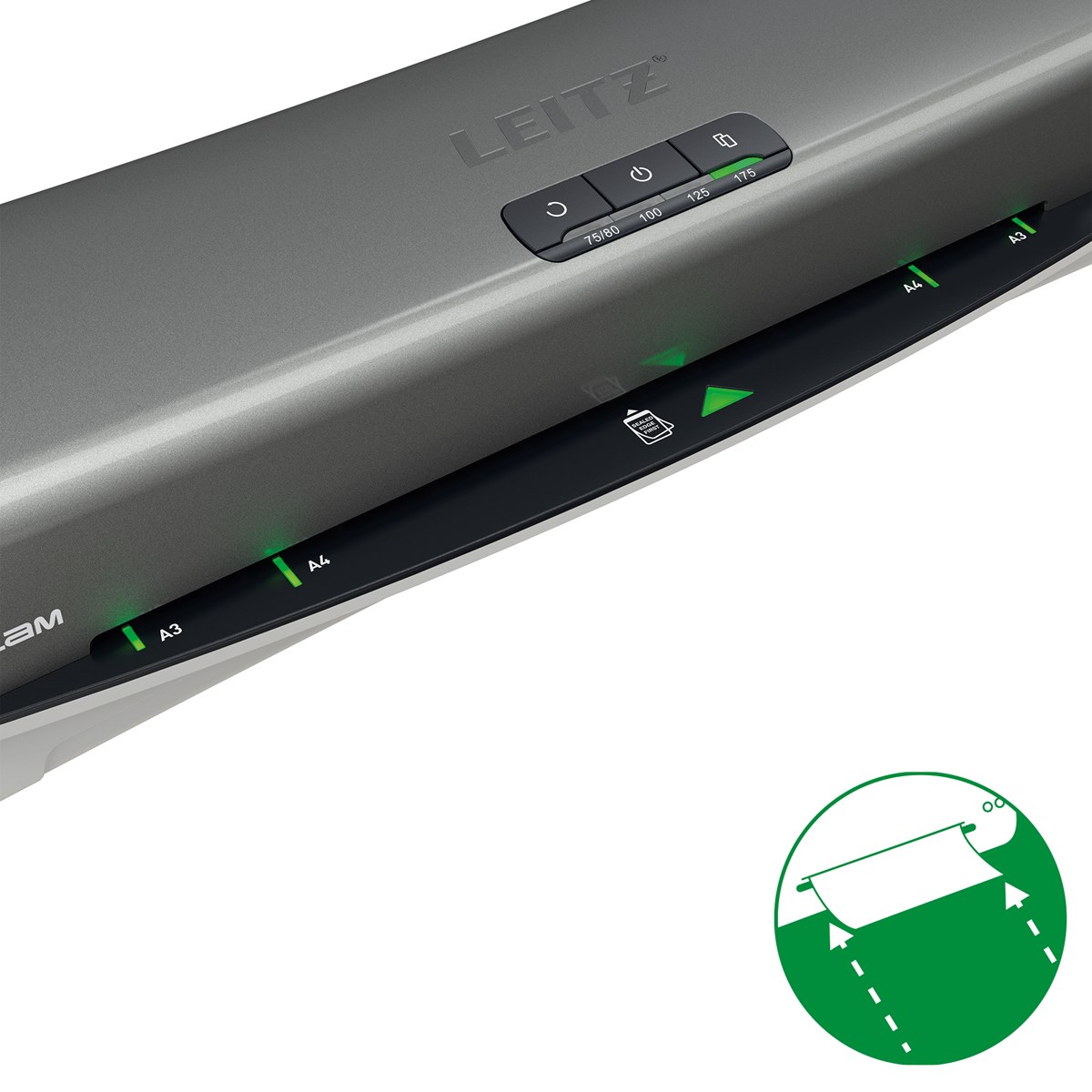 Den eleganta och sofistikerade lamineringsmaskinen Leitz iLAM Office Pro A3 kombinerar stil och hög prestanda på ett skickligt sätt. Denna A3-laminator är utformad för enkel användning och har en snabb uppvärmningstid på 1 minut och kan laminera ett A4-ark med 80 mikron på bara 23 sekunder, vilket ger ett snabbt och effektivt dokumentskydd. Den stilrena kontrollpanelen med belysta knappar ger enkel åtkomst till fyra inställningar för lamineringsfickans tjocklek. Den manuella anti-jam tillbaka-knappen med automatisk backning säkerställer problemfri drift genom att snabbt lösa eventuella stopp. Den innovativa smarta status-LED:n gör användningen enklare med intuitiva ljus och ljud: rött under uppvärmning, grönt med en ljudsignal när den är redo och blinkande rött för standby-läge efter 15 minuters inaktivitet. Dessutom säkerställer LED-lamporna SMART entry guide att lamineringsfickan är perfekt inriktad för att förhindra fastkörning.