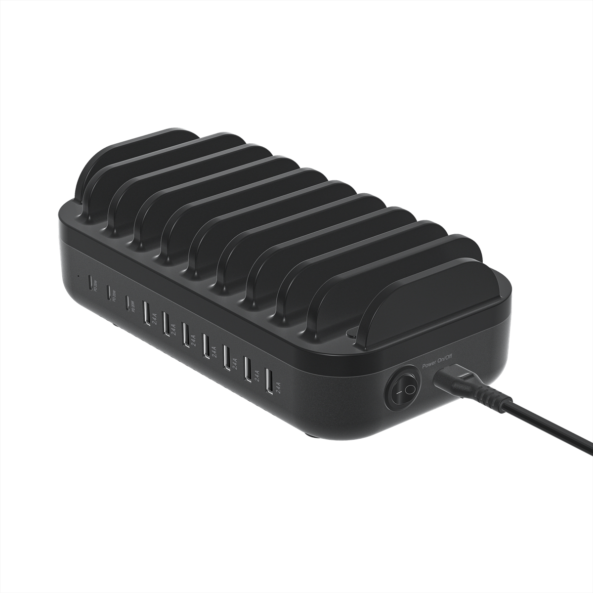 USB-laddningsstation för 7x USB-A 2.4 A (max 66 W), 3x USB-C PD 20 W, totalt max 120 W.