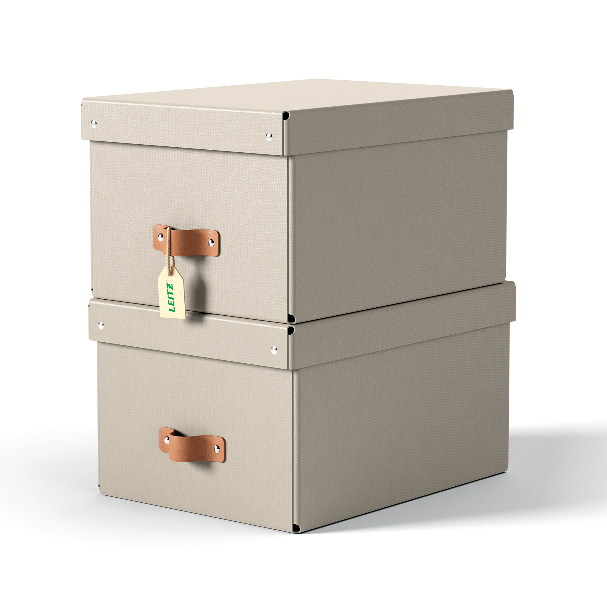 Urvalet av jordnära färger - inspirerade av naturens renhet och enkelhet - passar perfekt till din inredning och ger en känsla av lugn i dina rum och på dina kontor. Varje liten förvaringslåda från Leitz har ett draghandtag i läder som gör dem lätta att ta fram från hyllor och förvaringsenheter. Tillverkad i Italien.