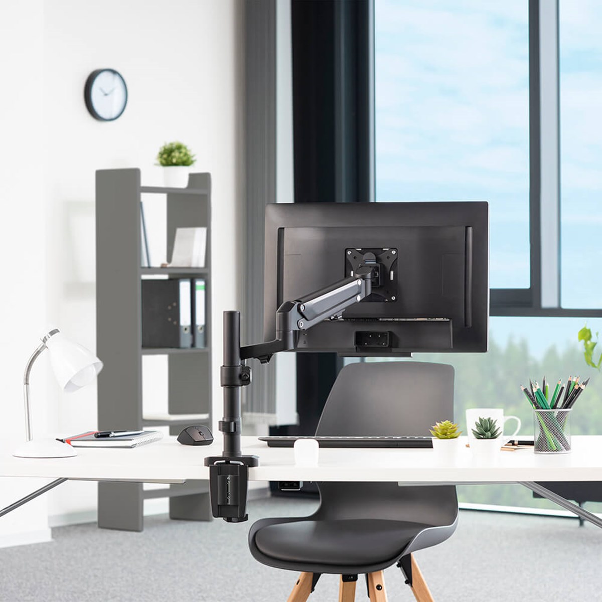 För bättre ergonomi, komfort och utrymme vid skrivbordet. För installation av TFT/LCD/LED-skärmar med en skärmdiagonal mellan 13" till 35". Kompatibel med skärmar med VESA-standard: 75 x 75, 100 x 100. Spänns fast på skrivbordet med medföljande klämma. Passar skrivbord med en tjocklek på upp till 8,5 cm. Kabelorganisering för smidig kabeldragning.