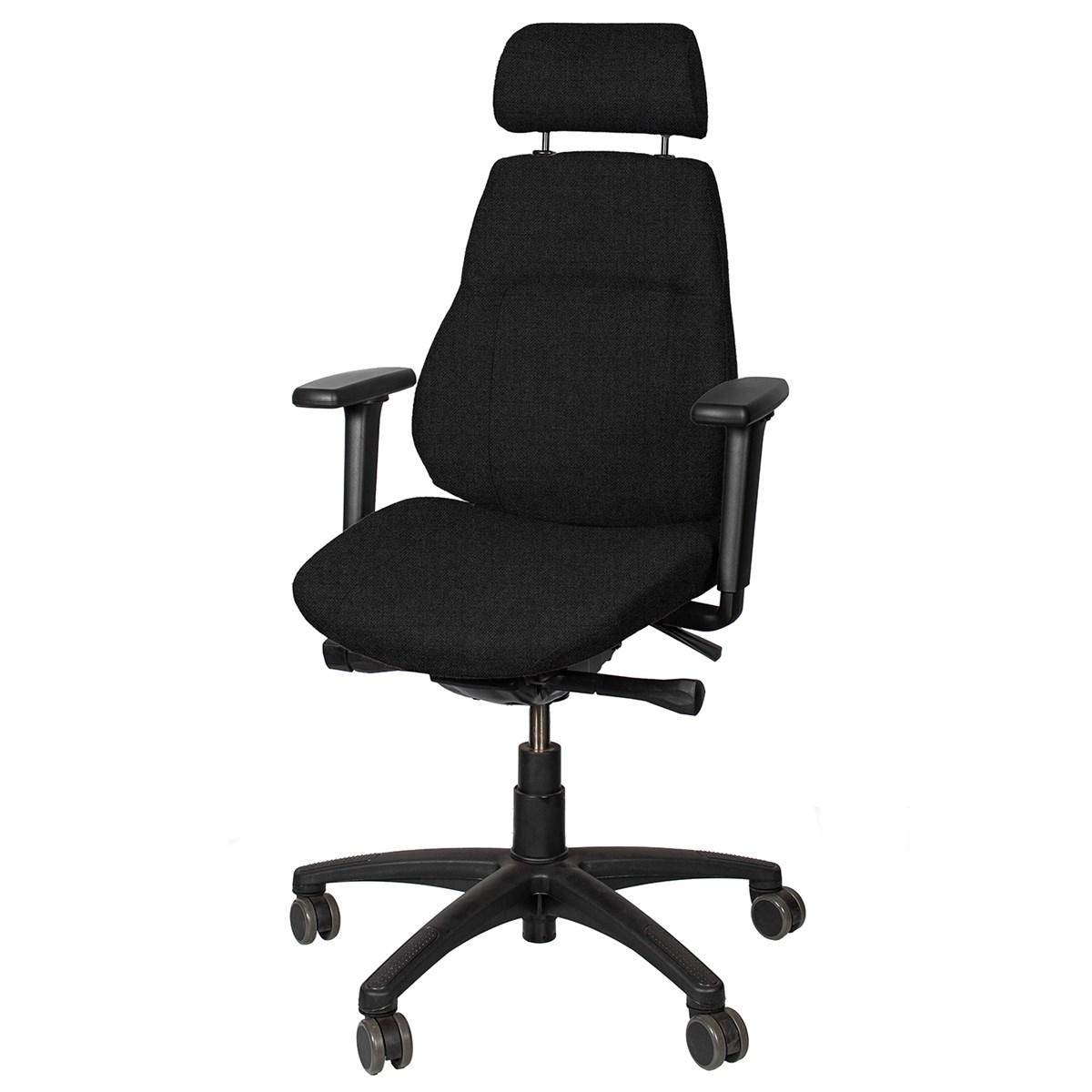 Justerbar sittdyna, höjning och vinkling av ryggen ger stora inställningsmöjligheter för användaren. Levereras med armstöd som är justerbara i höjd- och sidled. Nackstödet är justerbart i höjdled samt vinklingsbart. Utrustad med hjul för hårda golv. Levereras med ett slitstarkt, svart ulltyg (Gaja) som standard. Kan även fås i en kombination av ull/polyester. 5 års garanti.