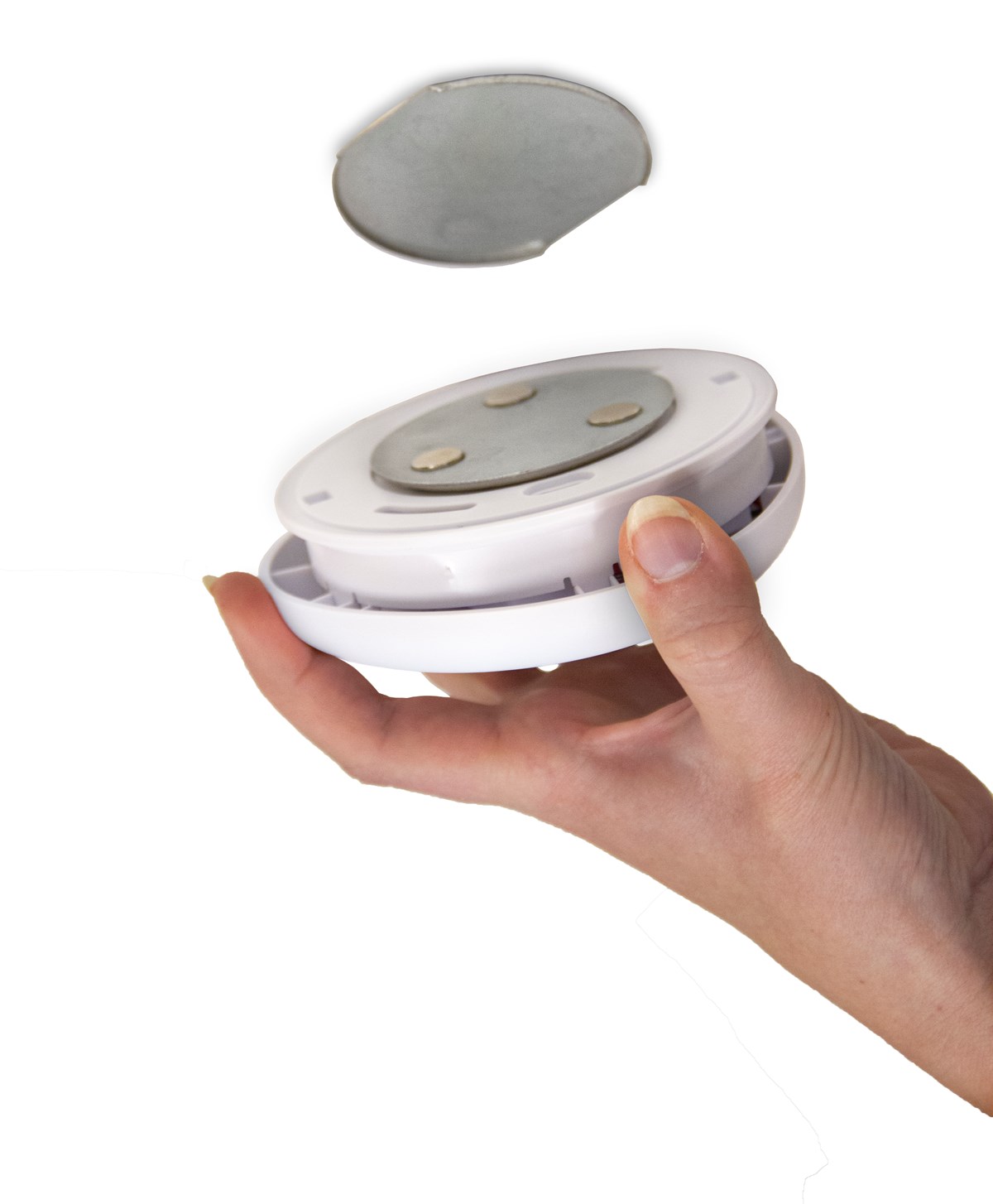 För dig som inte vill, kan eller får borra i taket. Innehåller två magnetplattor med självhäftande tejp som fästes i taket och på brandvarnaren. Passar varnare med en diameter på minst 60 mm.