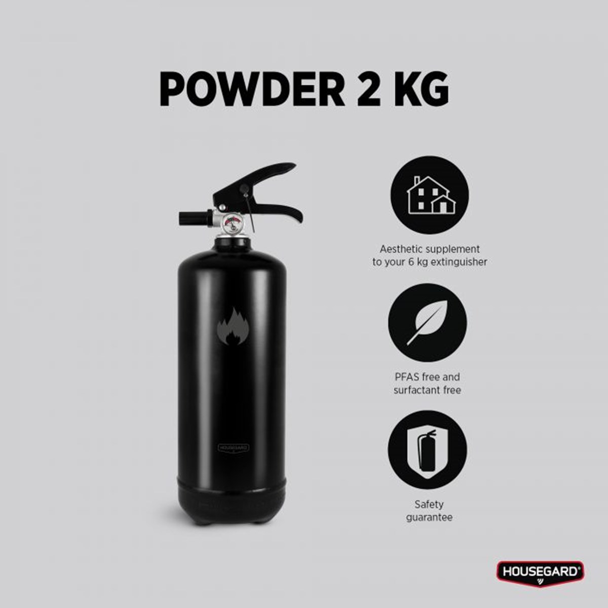 Vår svarta brandsläckare har en avskalad design samtidigt som den blir en stilren inredningsdetalj i det moderna hemmet. Den kontrastfulla, svarta färgen gör även att brandsläckaren står ut och tillåts ta plats, men inte på samma sätt som en klassisk röd brandsläckare. Brandsläckare i Design by Housegard-serien är avsedda för hemmamiljöer där användaren förväntas ha koll på var släckaren är placerad ifall olyckan är framme.