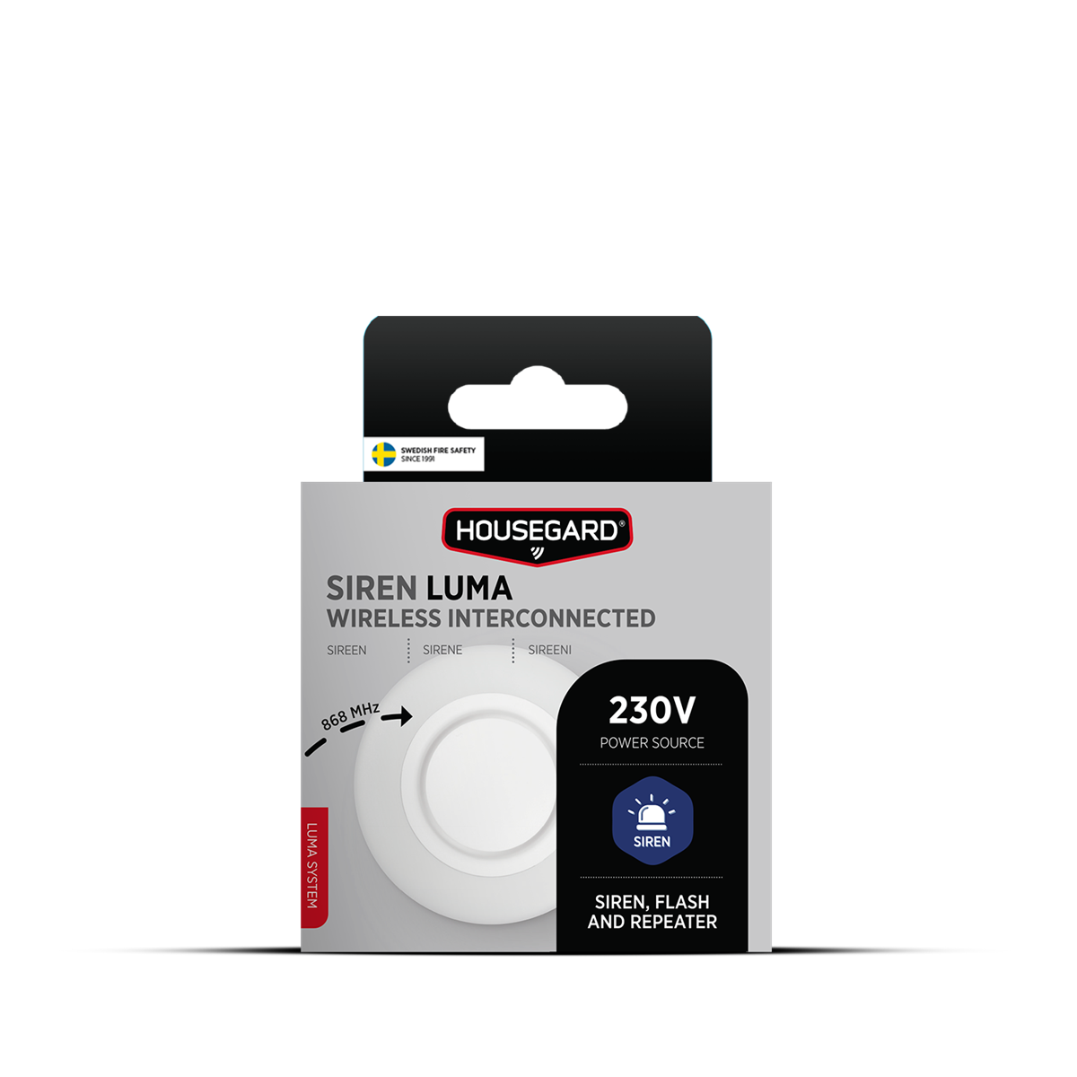 Vår trådlösa siren i Luma-serien erbjuder dubbla varningar med en kraftfull 95 dB siren och blinkande ljus, perfekt för personer med hörsel- eller synnedsättning. Den trådlösa repeatern förlänger Luma-systemets räckvidd och vidarebefordrar andra larmsignaler. Sirenen fungerar både med och utan Luma Hub. Luma Siren går att koppla samman med upp till 40 enheter. Larmar en, larmar alla – på så vis blir du varnad var du än befinner dig när en eventuell brand startar.