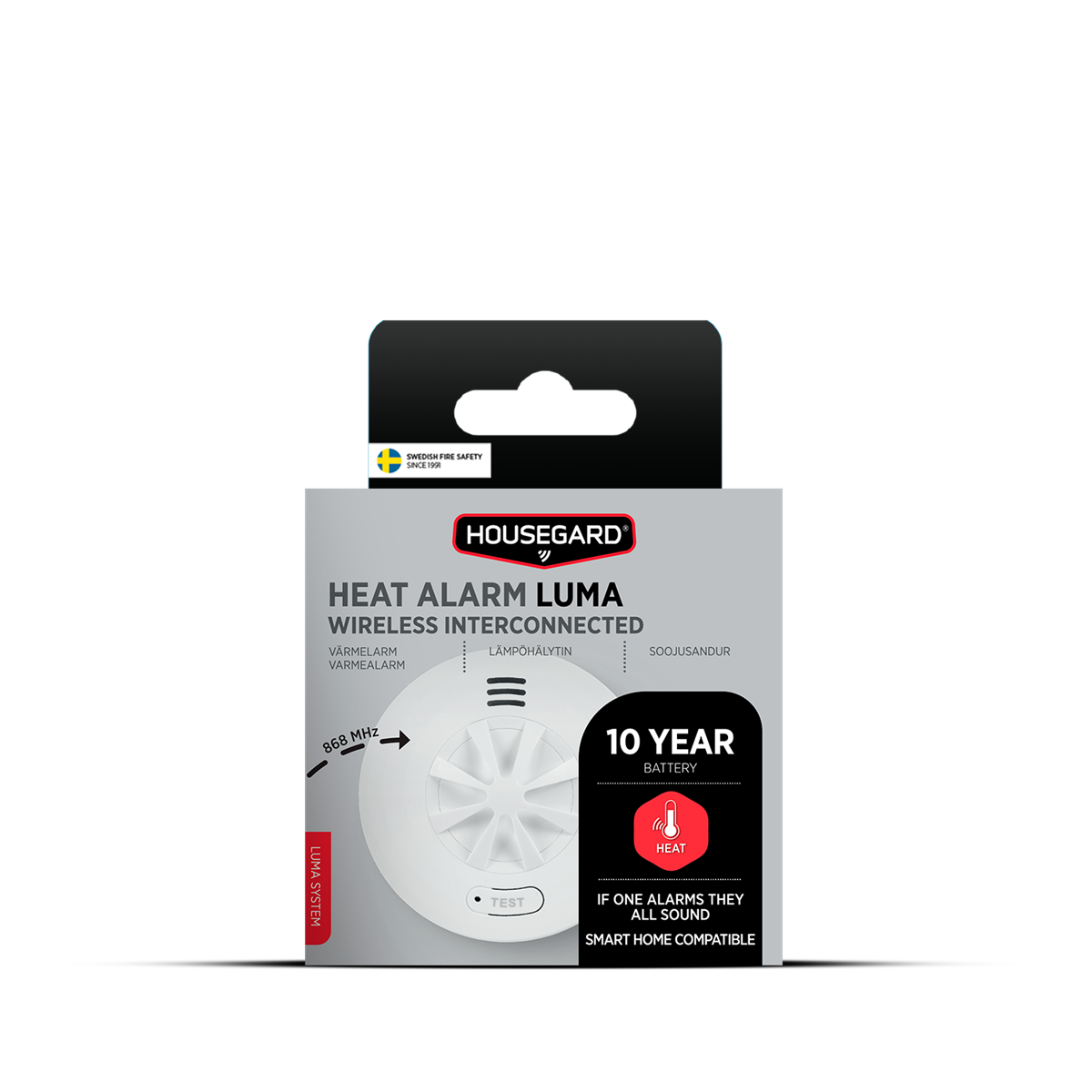 Luma är en seriekopplingsbar värmevarnare som går att koppla samman med upp till 40 enheter. Larmar en, larmar alla – på så vis blir du varnad var du än befinner dig när en eventuell brand startar.