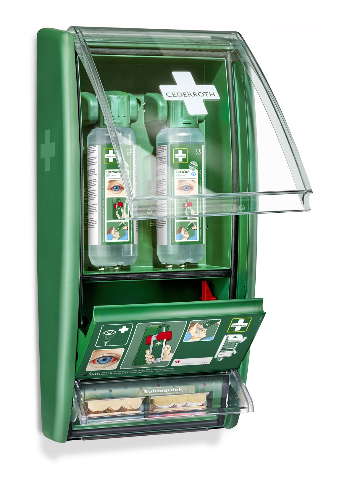 Cederroth Ögondusch – bevisat mer effektiv än koksaltlösning vid stänk från alkalier och syror.