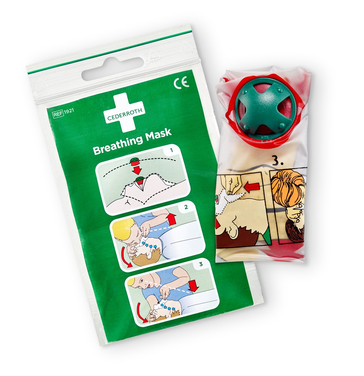 Cederroth Andningsmask är ett hjälpmedel för att ge mun-till-mun-andning på rätt sätt samtidigt som det minskar risken för kontakt mellan hjälpare och skadad. Andningsmasken består av en plastduk med backventil. På plastduken finns tydliga instruktioner för mun-mot-mun-metoden och hur masken ska placeras över den skadades ansikte. Backventilen signalerar vilken sida som skall placeras upp mot hjälparen (grön) respektive ned i den skadades mun (röd). Plastdukens storlek minskar risken för att hjälparen kommer i kontakt med blod eller uppkastningar från den skadade. Munstyckets utformning tvingar hjälparen att gapa stort och pressa sina läppar runt den skadades mun så att det sluter tätt. Backventilen har stora hål vilket minskar motståndet och underlättar för hjälparen att orka genomföra ett längre pass konstgjord andning.