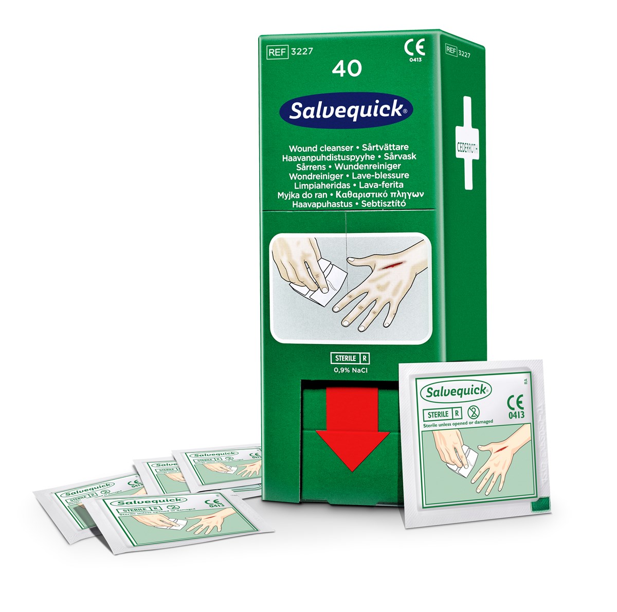 Salvequick Sårtvättare ersätter bomull och sårlösning i flaska. Smidiga och enkla att använda. Väl skyddade i sina förpackningar. Rengöringsvätskan utgörs av steril fysiologisk koksaltlösning.