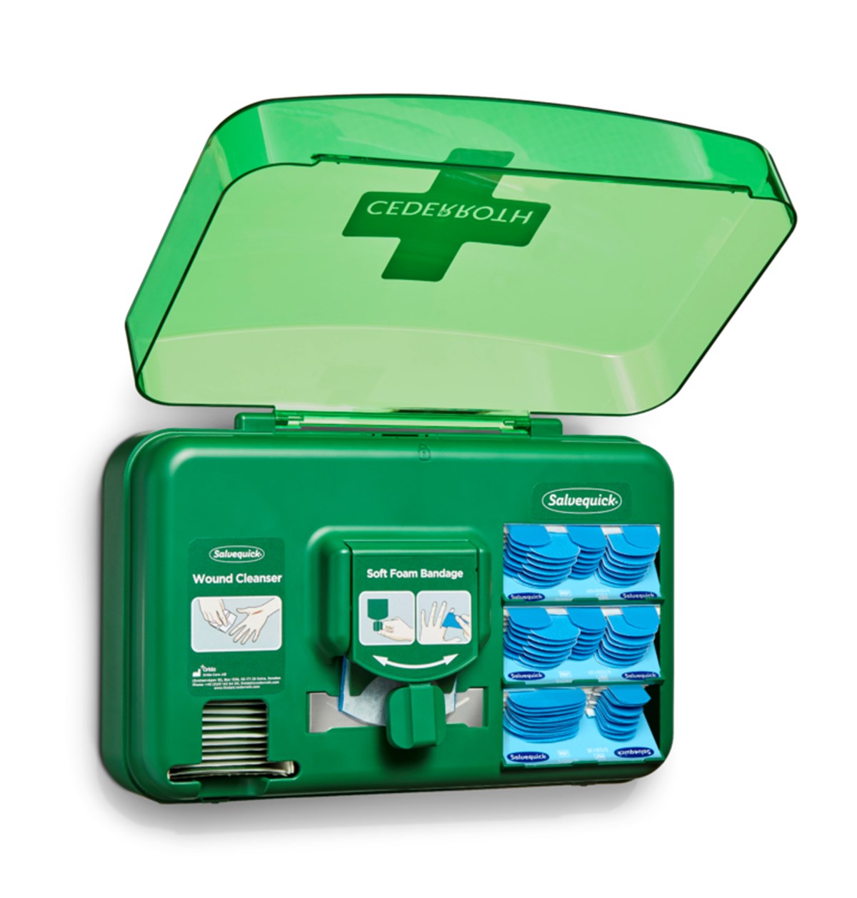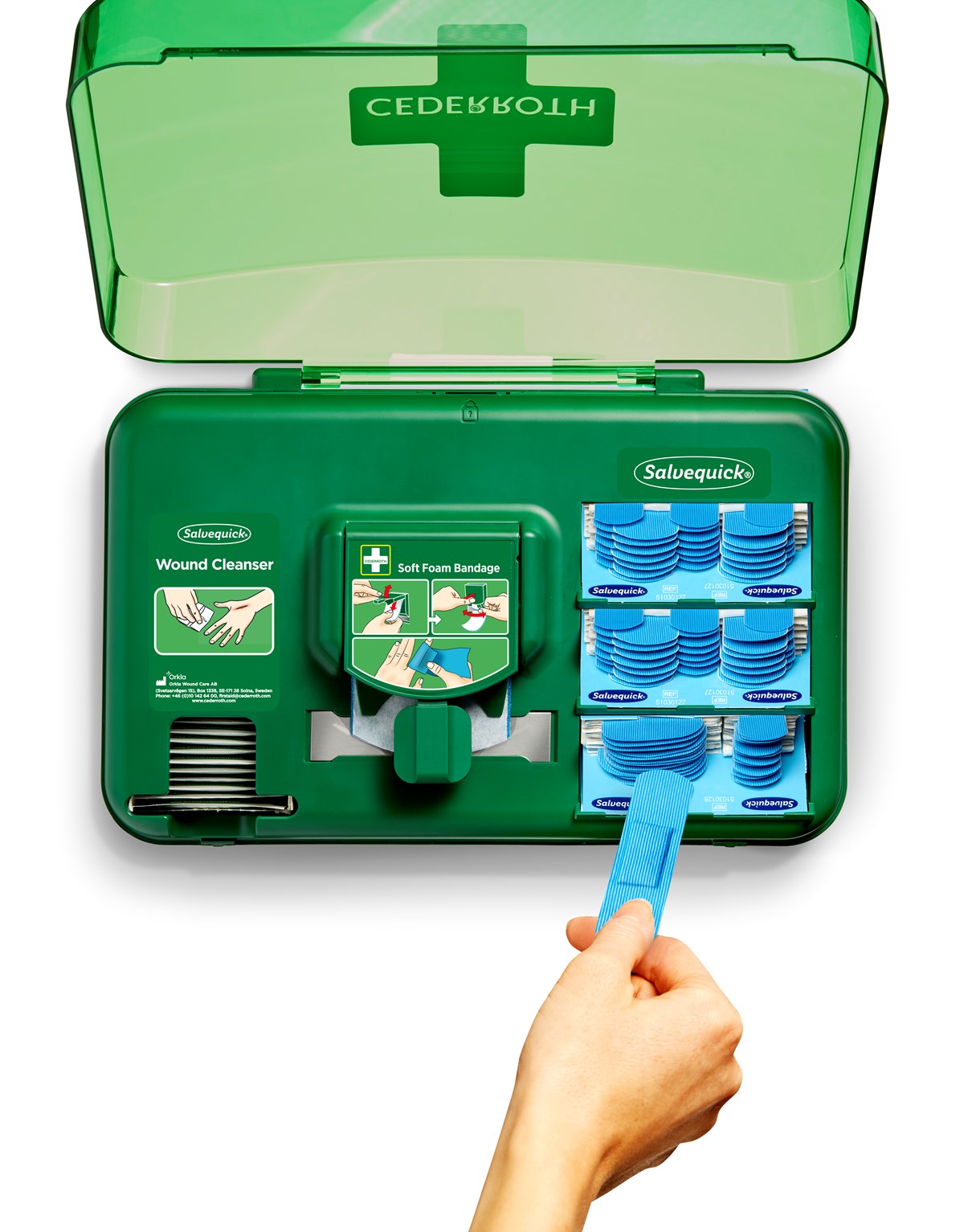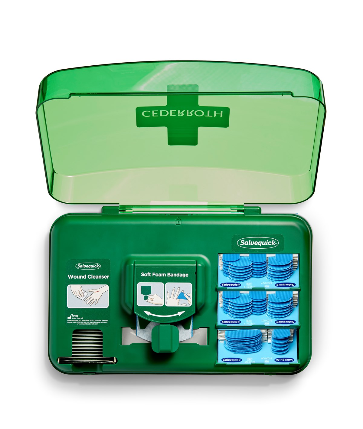 Innehåll: - Salvequick Sårtvättare, 40 st (REF 3227) - Cederroth Soft Foam Bandage Blue 4,5 m (REF 51011010) - 2 x Salvequick Blue Detectable, 35 st (REF 51030127) - Salvequick Blue Detectable plaster mix , 30 st (51030126) - 1 Refillnyckel