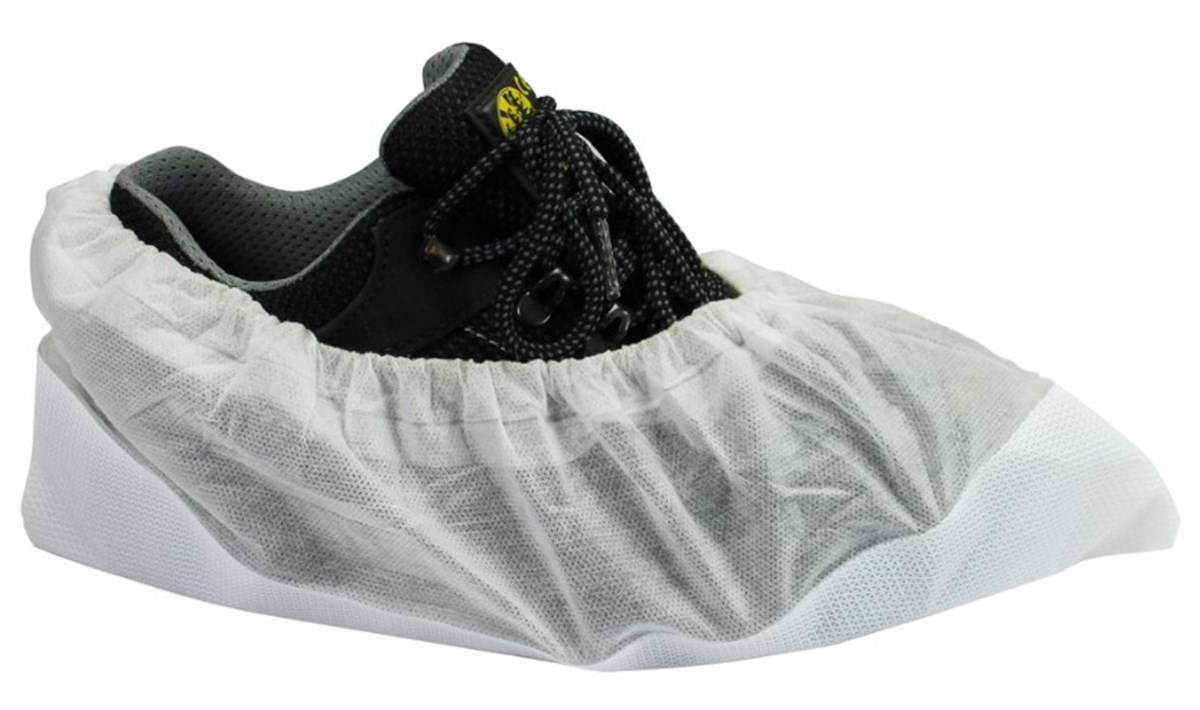 Skoskydd av polypropylen non-woven material med resår. Kraftig PE-sula. Tjocklek: 100 my. Cat.I. EC1935. Godkänd för livsmedel.
