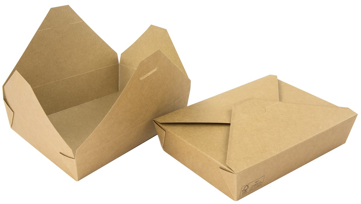 Hämtboxar i naturfärgad kartong. Boxarna är helt täta i botten och passar utmärkt för avhämtning av t.ex. thailändsk mat.