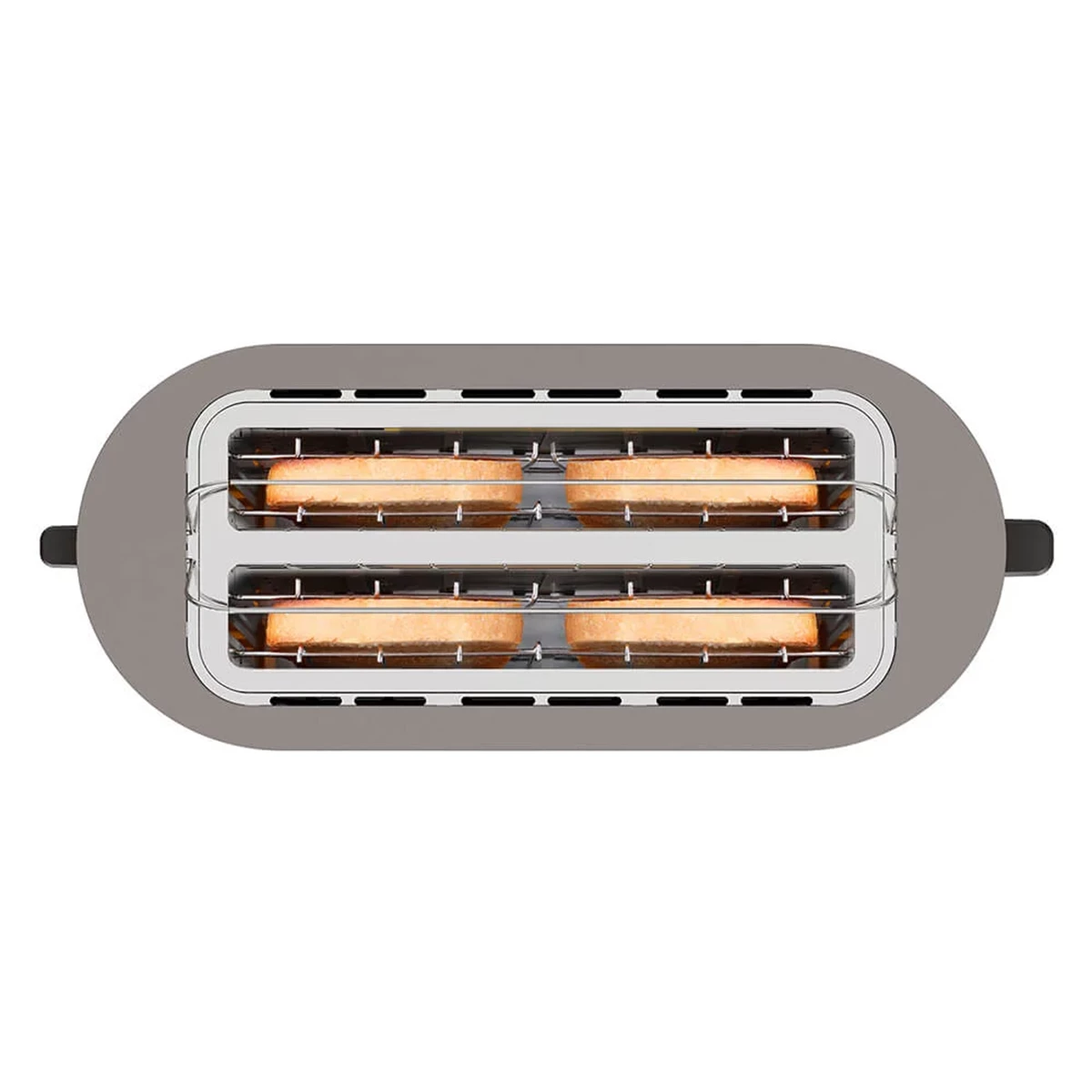 Brödrosten har ett hopfällbart galler för att värma bakverk ovanpå slitsarna och dess moderna, rundade och robusta design, helt gjord av rostfritt stål, kommer att se bra ut i alla kök.