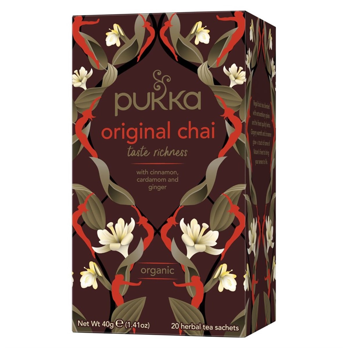 Pukka original chai är ett svart te med värmande örter som innehåller kanel, kardemumma och ingefära samt en söt lakrits. Kanel och ingefära är värmande örter och kardemumma är härligt aromatisk samt att lakrits är sött och traditionellt känt för sina lugnande egenskaper.