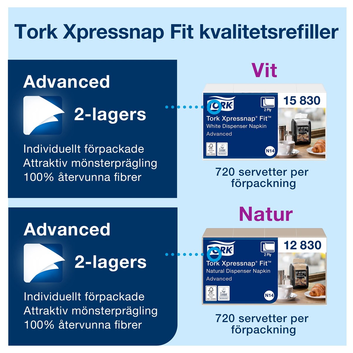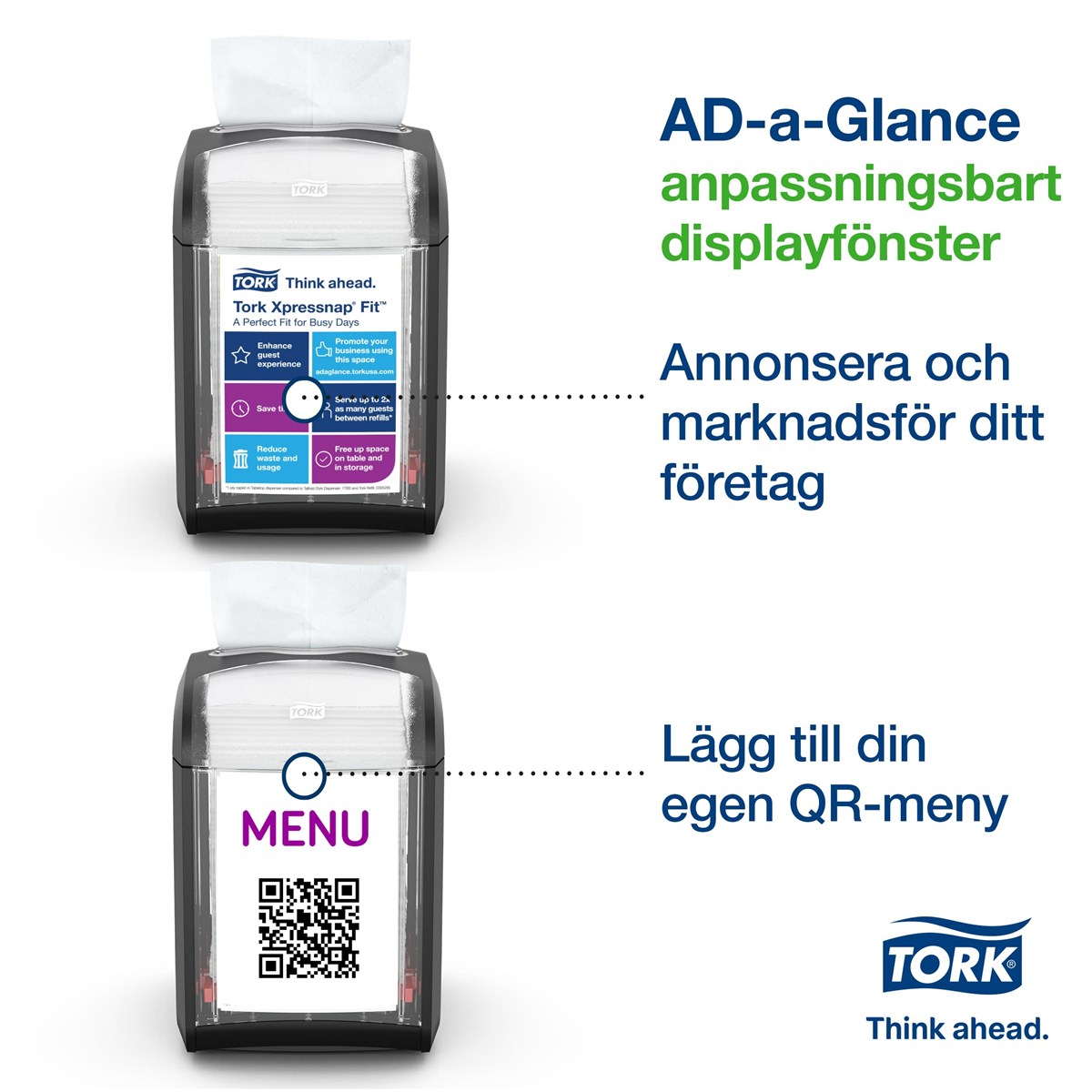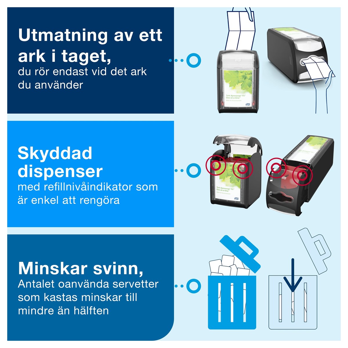 Kompakt, toppmatad dispenser som matar ut en servett i taget vilket minskar förbrukningen och avfallet. Utmärkt för bord och diskar. Placera eget budskap i reklamrutan. Enkel påfyllning och refillindikator som visar när det är dags att fylla på nya servetter. Rymmer 168 st N14-servetter. Format: L14,1 x B11,3 x H17 cm.