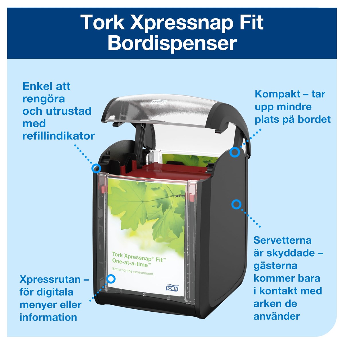 Kompakt dispenser som rymmer fullstora servetter och tar liten plats på bordet