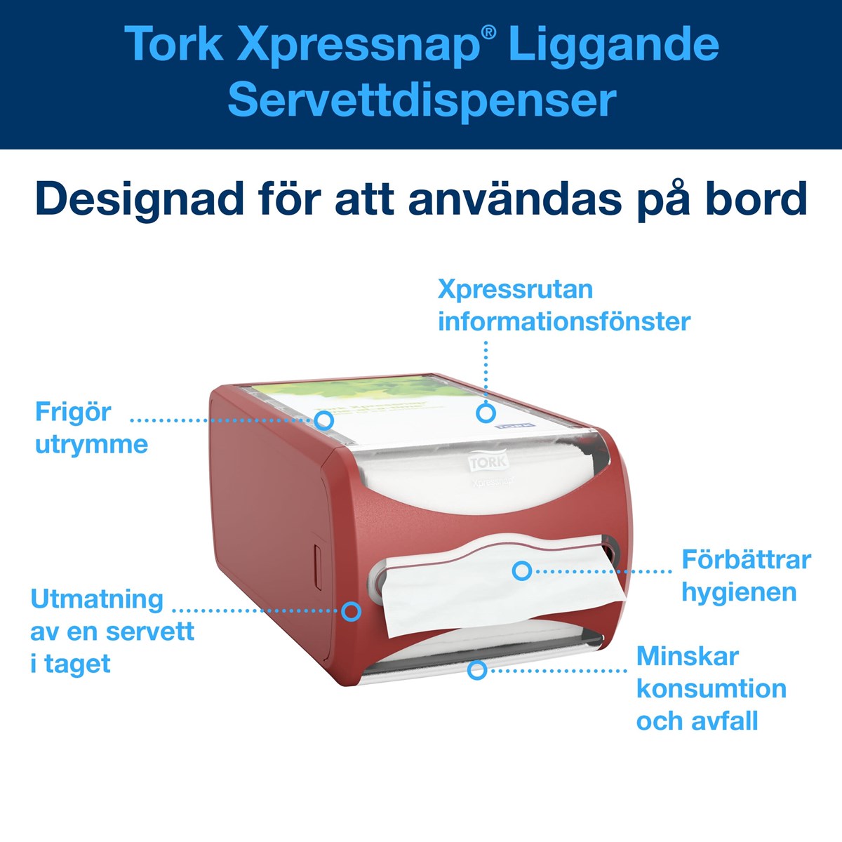 Liggande servettdispenser som kan staplas ovanpå varandra. Placera eget budskap i reklamrutan. Rymmer 550 st N4-servetter. Format: H14,5 x B19,1 x D30,5 cm.