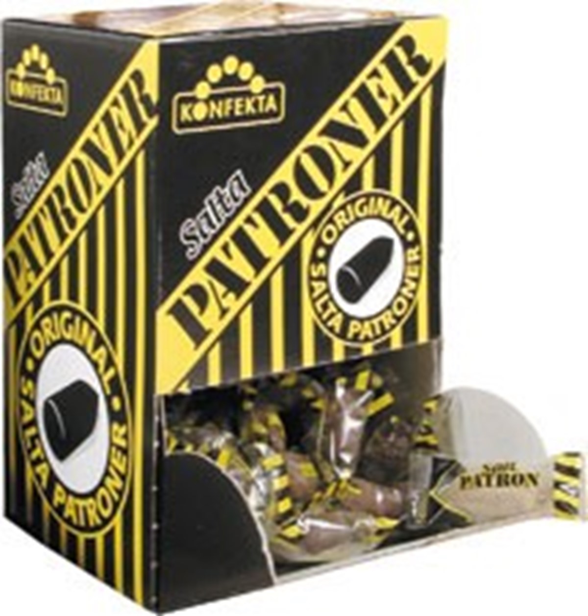 Salta Patroner från Konfekta är en saltlakrits karamell som ryms i var och varannan godispåse. De salta patronerna är smidigt portionsförpackade, hårda, salta och oemotståndligt goda och älskas av både stora som små. Då patronerna är portionsförpackade kan kunderna enkelt köpa med sig en eller flera och förvara i sin jackficka utan klet. Perfekt att sälja i butik, kiosk, förening m.m.