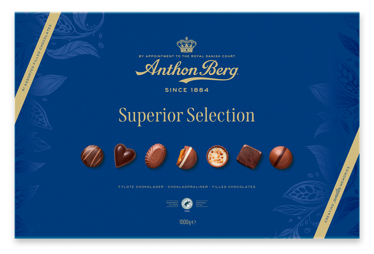 Anthon Berg Superior Selection, en ask med speciellt utvalda och klassiska fyllda praliner. Asken innehåller utsökta praliner med marsipan, plommon i Madeira, Cointreau-flaska, nougat, kokos, tryffel och krämig karamell. Superior Selection är idealisk som gåva eller att dela med familj och vänner
