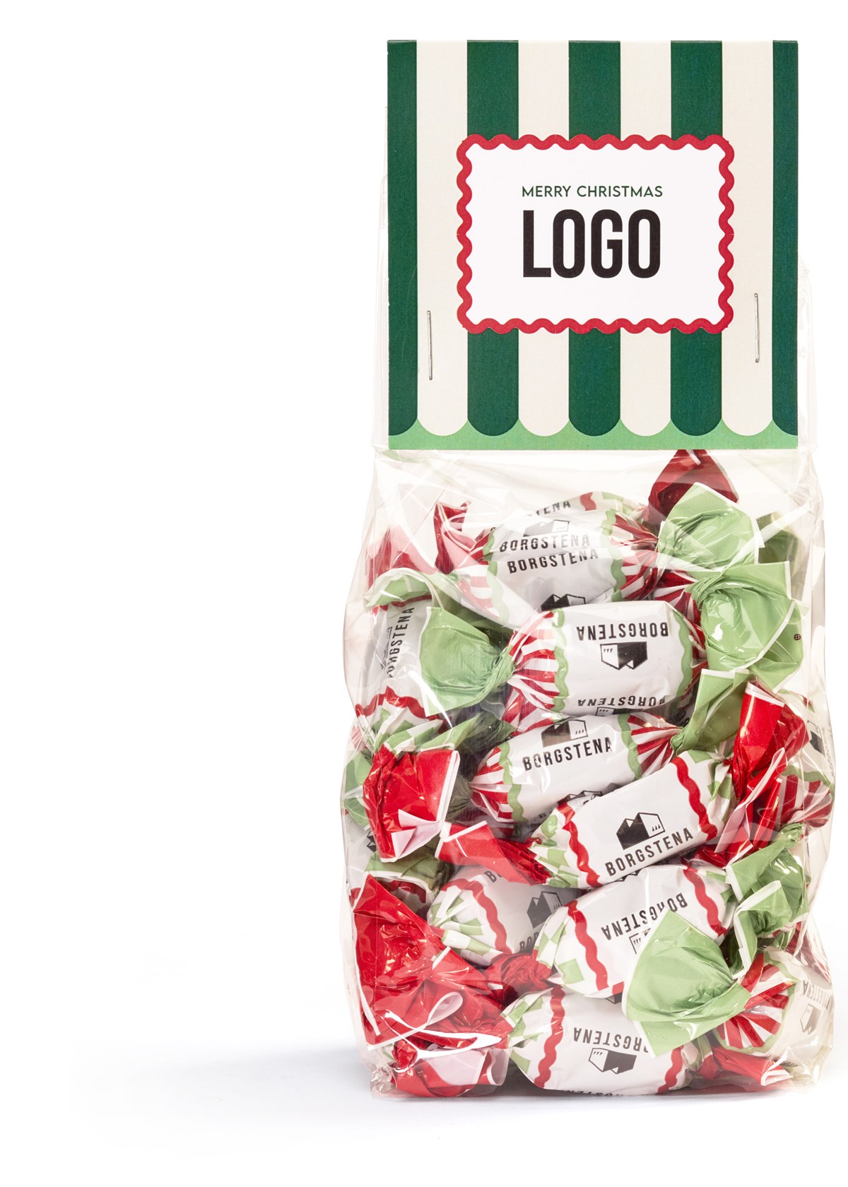 Cellofanpåse av återvunnen plast med ryttare i FSC-certifierat papper fylls med en härlig julmix av chokladdragerad kola från Borgstena. Smakerna är caramel och lakrits vilket ger en härlig baldning av sött och salt. Det twistade pappret är även komposterbart. Tryck din logga eller ditt budskap på produkten.