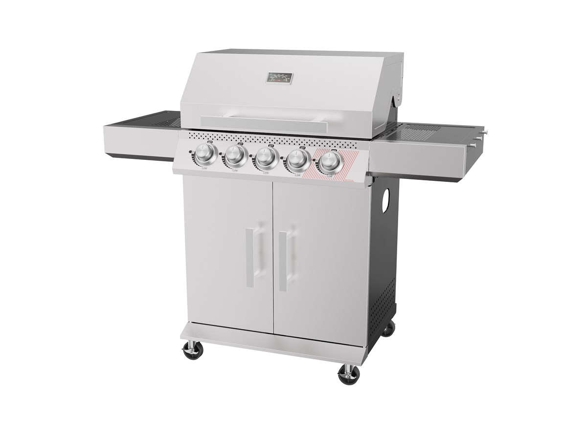 Specifikationer: - Grillyta: 68 x 42 cm - Antal huvudbrännare: 5 (varav en sizzle burner) - Effekt per huvudbrännare: 3 kW (sizzle burner: 4 kW) - Material, huvudbrännare: Rostfritt stål - Total effekt: 16 kW - Material, flamtämjare: Extra kraftigt 430 rostfritt stål - Tändningssystem: Piezotändning - Gastryck: 30 mbar - Antal grillgaller: 2 - Material, grillgaller: Emaljerat gjutjärn - Värmehylla för värmehållning av mat - Material, värmehylla: 304 rostfritt stål - Förvaringsskåp med dubbla dörrar - Vred och handtag i gjuten aluminium med extra hög finish - Material, grill: Rostfritt stål, lackerat stål - Arbetshöjd: 87,5 cm - B x D x H: 133 x 57 (66) x 112 cm - Produktvikt: 40 kg - Uttag för rotisserie: Ja - Rekommenderad gasolflaska: PC5 eller PC10 (köps separat)