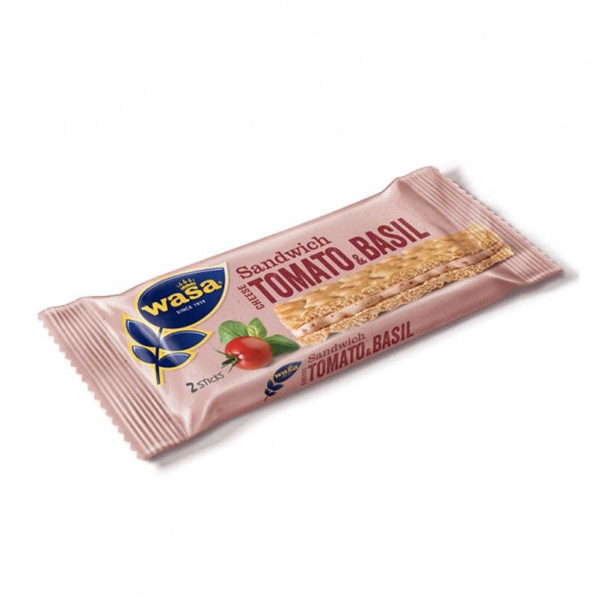 Wasa Sandwich veteknäckebröd med krämig fyllning av Cheese, Tomato & Basil. Två mättande och goda knäckbrödstick som gör mellanmålet lätt att dela med sig av när du är på språng eller på utflykt.