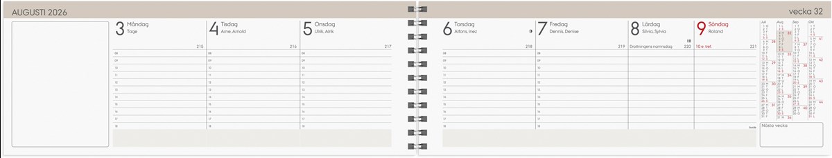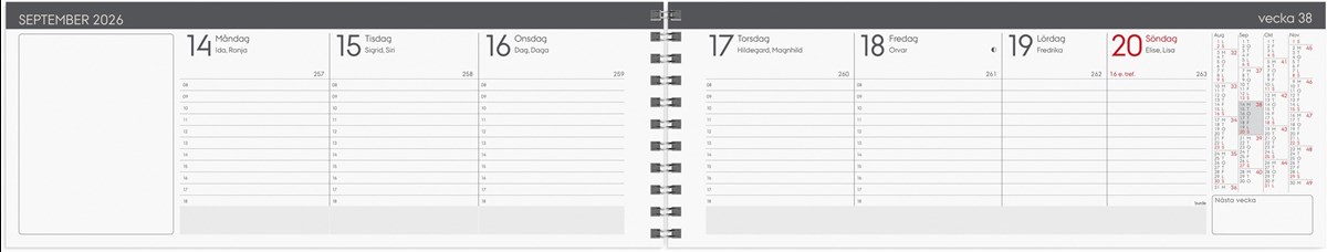 Format: 255x95 mm. Layout: Stående. Vecka/uppslag. Timindelning 8-18. Kalendarium: 2025-12-22 - 2027-01-03. Omslag: Kartong. Spiralbunden. Innehåll: Kyrkliga helgdagar, Flaggdagar, Helgdagar/aftnar, Månfaser, Namnsdagar, Internationella helgdagar översikt, Temadagar/händelser, Årsöversikt/årsöversikter, Årsplan/årsplaner. Antal sidor: 120. Miljöinformation: FSC®.