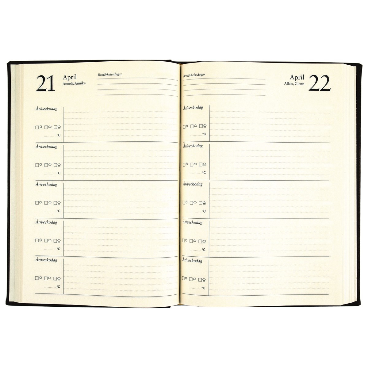 Årsneutral dagbok som sträcker sig över fem år. Inbunden. Namnsdagsregister. Cognacsfärgat konstläder. Format: 142 x 205 mm.