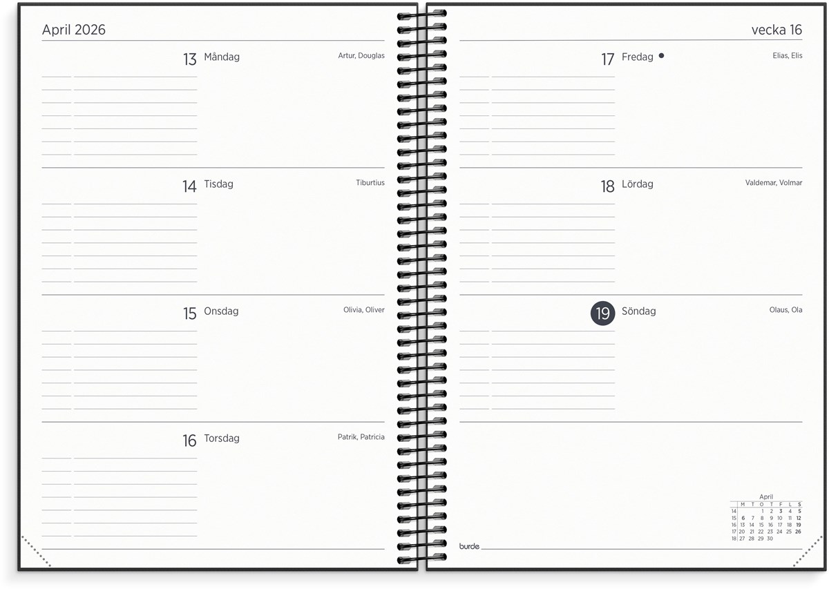 En kalender och anteckningsbok i ett! Första halvan innehåller ett kalendarium med horisontell veckolayout, medan andra halvan är linjerade sidor för dina listor och anteckningar. Med hjälp av de flyttbara flikarna förflyttar du dig smidigt mellan veckoplanering och anteckningar. Perfekt som komplement till digital planering. Klädd i en svart strukturerad kartong blir Organizer & Notes en stilfull följeslagare på möten och i vardagslivet.