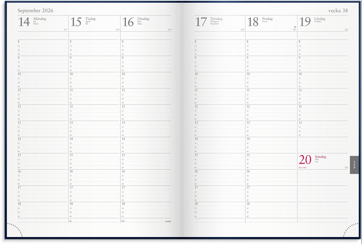 Kalender 2026 från Burde. Format: 195x260 mm. Layout: Stående. Vecka/uppslag. Quarteerly division 8-19. Kalendarium: 2024-12-31 - 2026-01-04. Omslag: Konstläder. Inbunden. Detaljer: Märkband. Innehåll: Årsöversikter, årsplaner, internationella helgdagar. Antal sidor: 112. Miljöinformation: FSC®.
