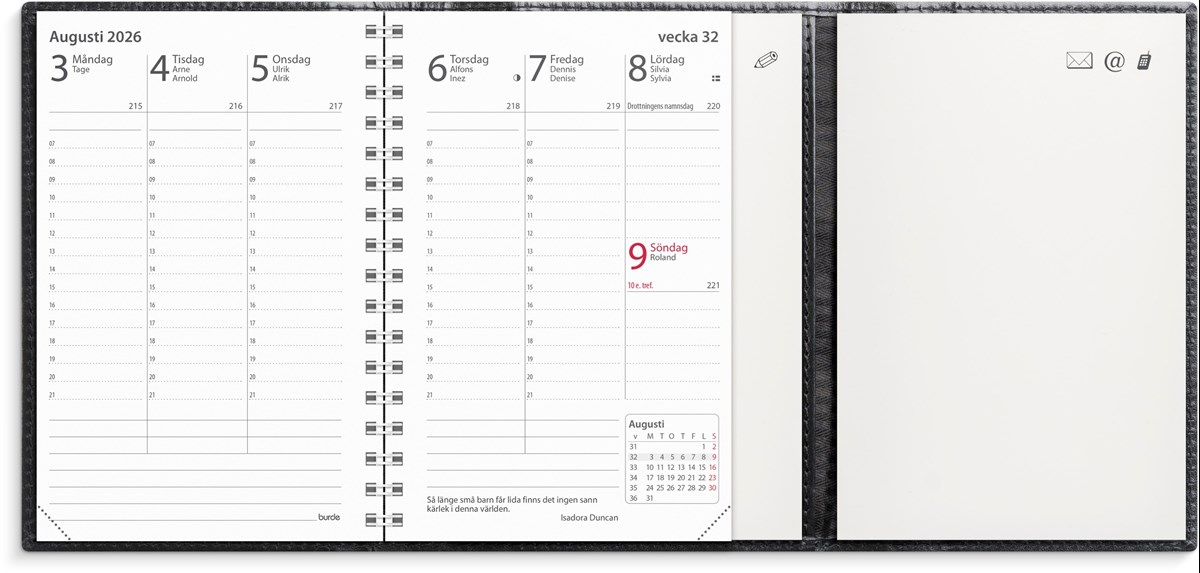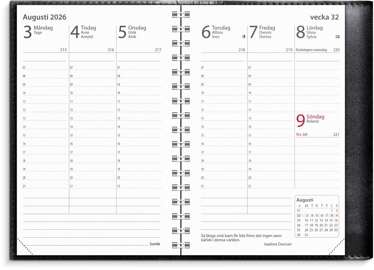 Format: 83x127 mm. Layout: Stående. Vecka/uppslag. Timindelning 7-21. Kalendarium: 2025-12-08 - 2027-01-03. Omslag: Skinn. Spiralbunden. Innehåll: Atlas, Kyrkliga helgdagar, Flaggdagar, Helgdagar/aftnar, Månfaser, Namnsdagar, Anteckningshäfte, Internationella helgdagar översikt, Telefonregister, Temadagar/händelser, Årsöversikt/årsöversikter, Årsplan/årsplaner. Antal sidor: 152. Miljöinformation: FSC® papper.