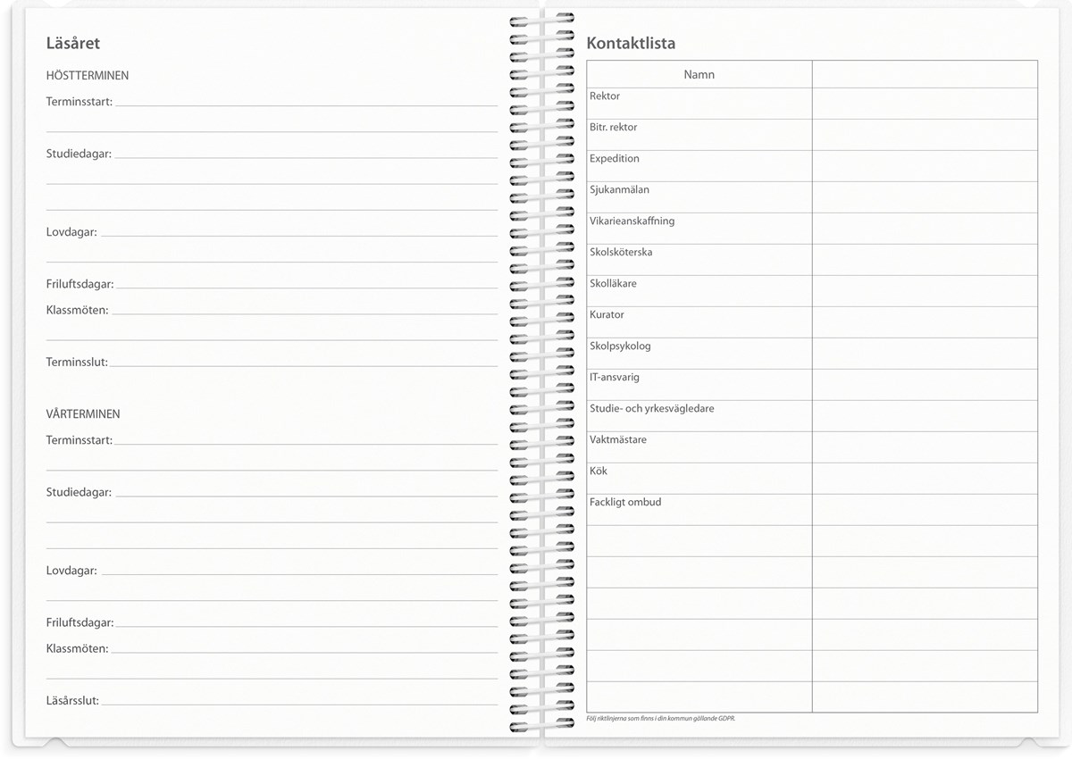Effektivisera din vardag som lärare med hjälp av en lärarkalender, som ett analogt komplement till din digitala planering. Att planera och tydliggöra dina dagar och terminer med papper och penna ger dig själv ett ögonblick av reflektion och fokus. Kalendern ger dig även möjlighet att se över utmaningar och framgångar i din vardag som lärare. Här finns plats för allt ifrån scheman och klasslistor till betygstabeller. Falsat ark för elevnamn ingår samt ett utbytbart framsidemotiv.