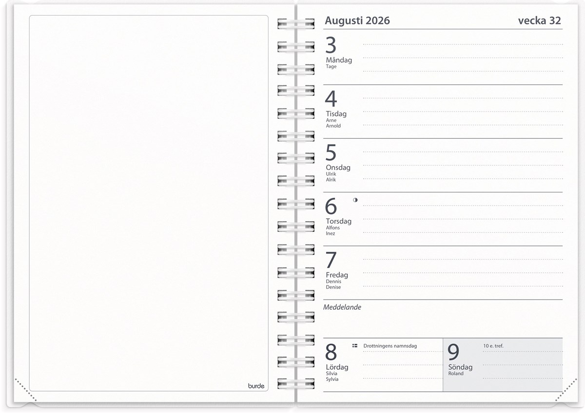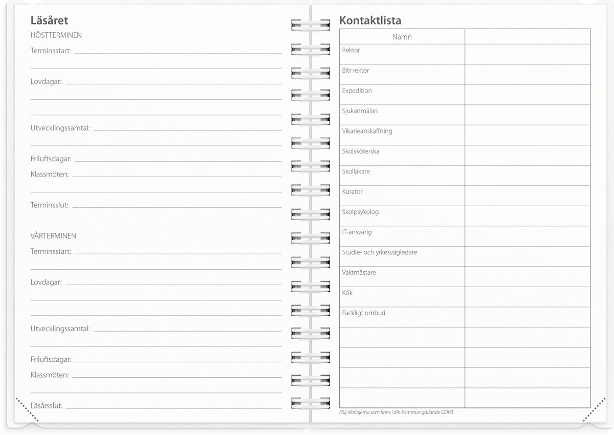 Format: A6. Mått: 15 x 118 x 157 mm. Layout: Vecka/uppslag. Liggande. Kalendarium: 2026-08-03 - 2027-08-15. Omslag: PP-plast och plastficka med tryckt blad. Spiralbunden. Detaljer: Gummiband. Plastficka. Innehåll: Kyrkliga helgdagar, flaggdagar, helgdagar/aftnar, månfaser, namnsdagar, temadagar/händelser, årsplan/årsplaner, kontaktlista, anteckningssidor, schema, elevförteckning, provresultat. Antal sidor: 128. Miljöinformation: FSC®.