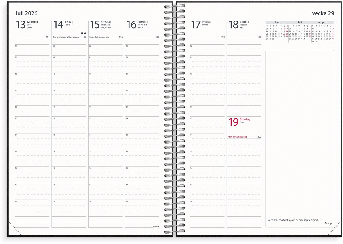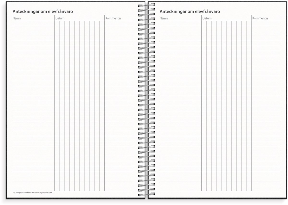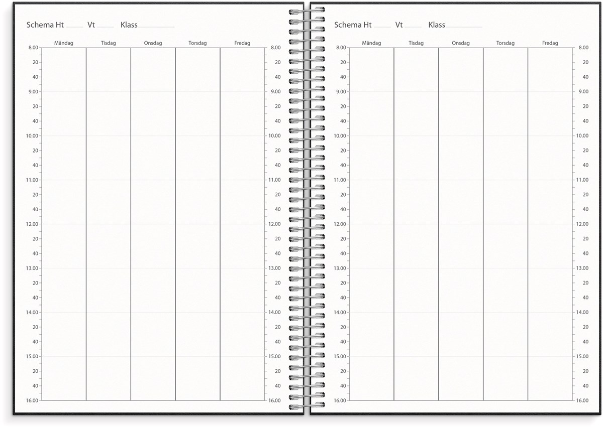 Format: A5. Mått: 170 x 25 x 215 mm. Layout: Vecka/uppslag. Stående. Timindelning 8-18. Kalendarium: 2026-05-25 - 2027-08-22. Omslag: Återvunnen kartong. Spiralbunden. Detaljer: Gummiband. Flyttbar plastlinjal. Pappersficka. Innehåll: Kyrkliga helgdagar, flaggdagar, helgdagar/aftnar, månfaser, namnsdagar, temadagar/händelser, årsplan/årsplaner, kontaktlista, schema, elevfrånvaro, elevförteckning. Antal sidor: 272. Miljöinformation: FSC®.