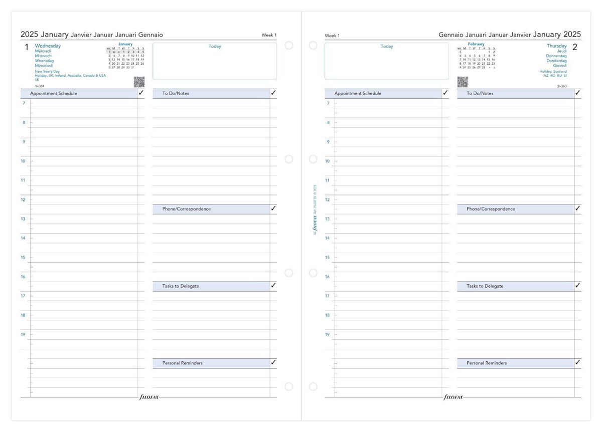 Planera din dag i detalj med dagbok som visar en dag per sida. Lördag och söndag på samma sida. Femspråkig. Kompatibel med Filofax systemkalender och Clipbook.