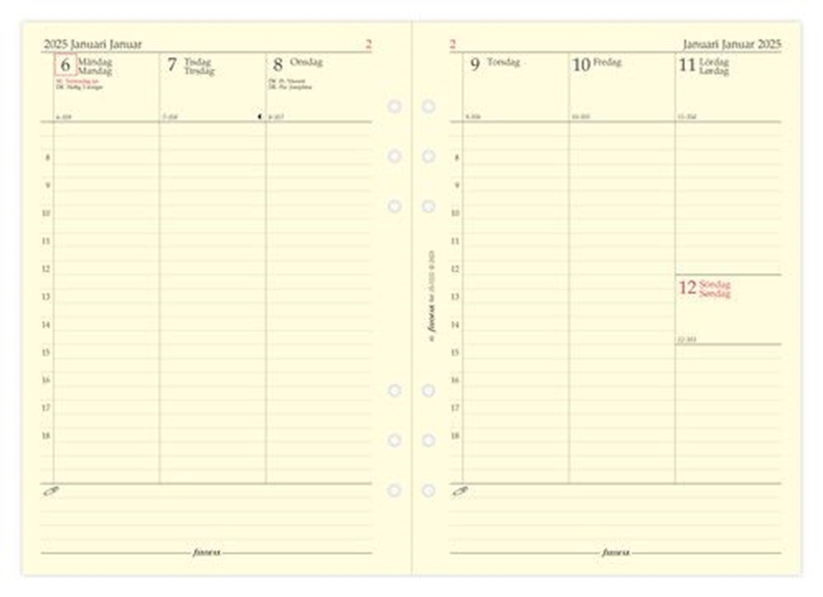 För veckoplanering med en vecka per uppslag. Vertikal. Trespråkig, svenska, danska och norska. Crémefärgat papper.
