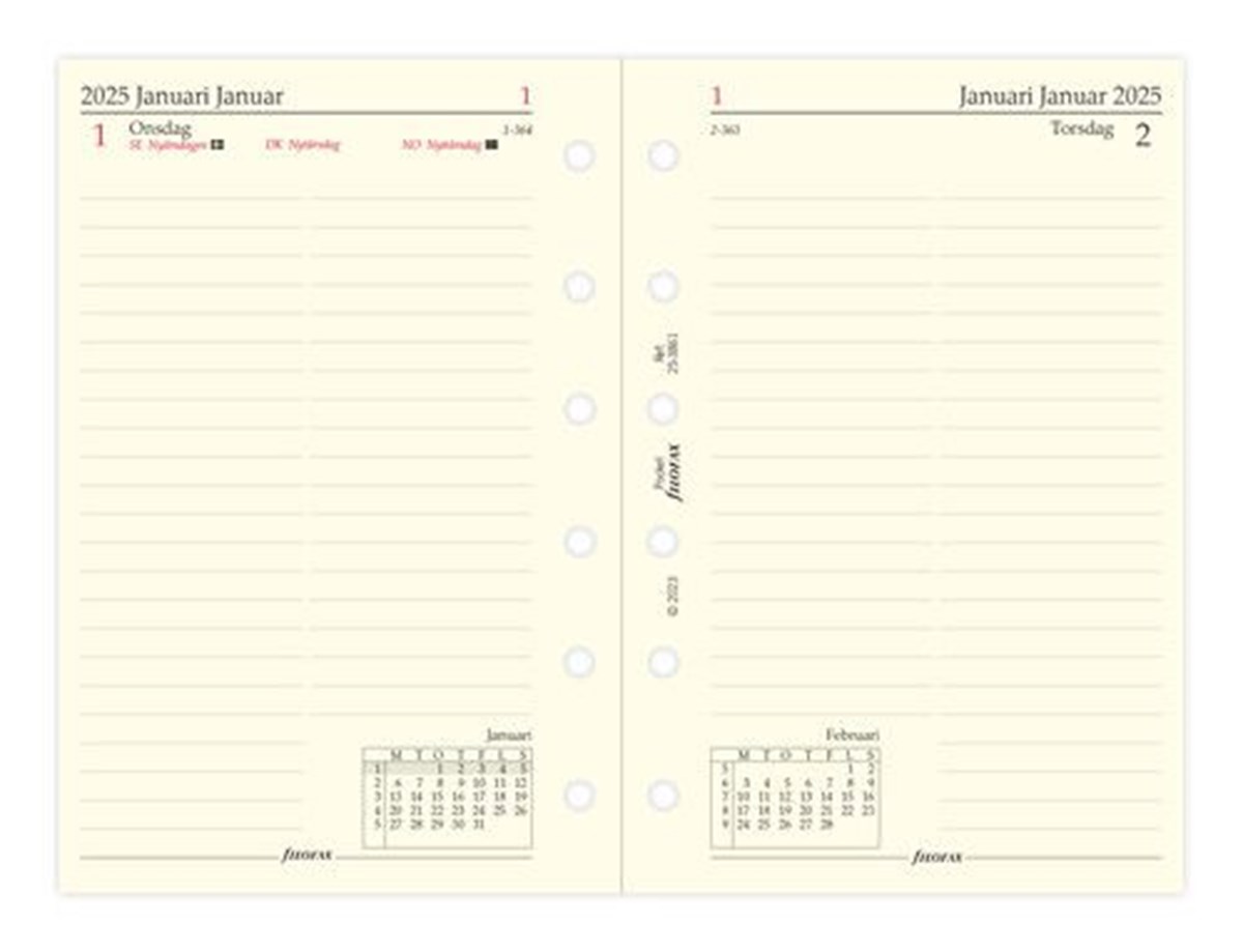 Dagboken passar alla Filofax Pocket-pärmar. Täcker januari - december 2025, en dag per sida. Trespråkig kalender, svenska, danska och norska.