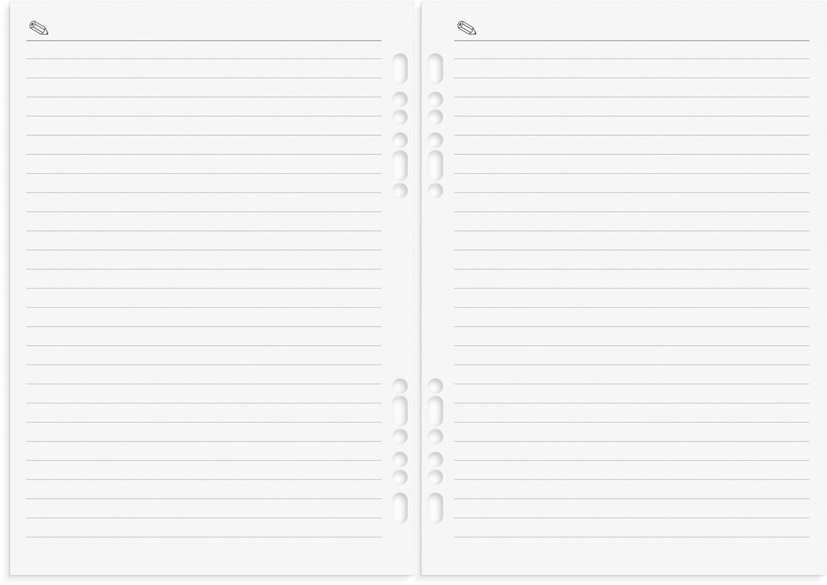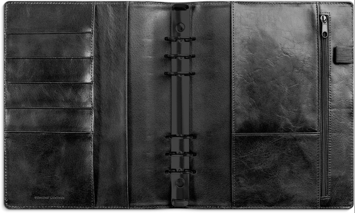 Systemkalender med grundsats. Grundsatsen innehåller hålad kalenderdel (4801) och blankettdel. Pärmen har ringmekanism (Ø 30 mm), fem kreditkortsfickor, stort myntfack med dragkedja, fack för kvitton o dyl och pennhållare. Format pärm: 185x235 mm (A5).