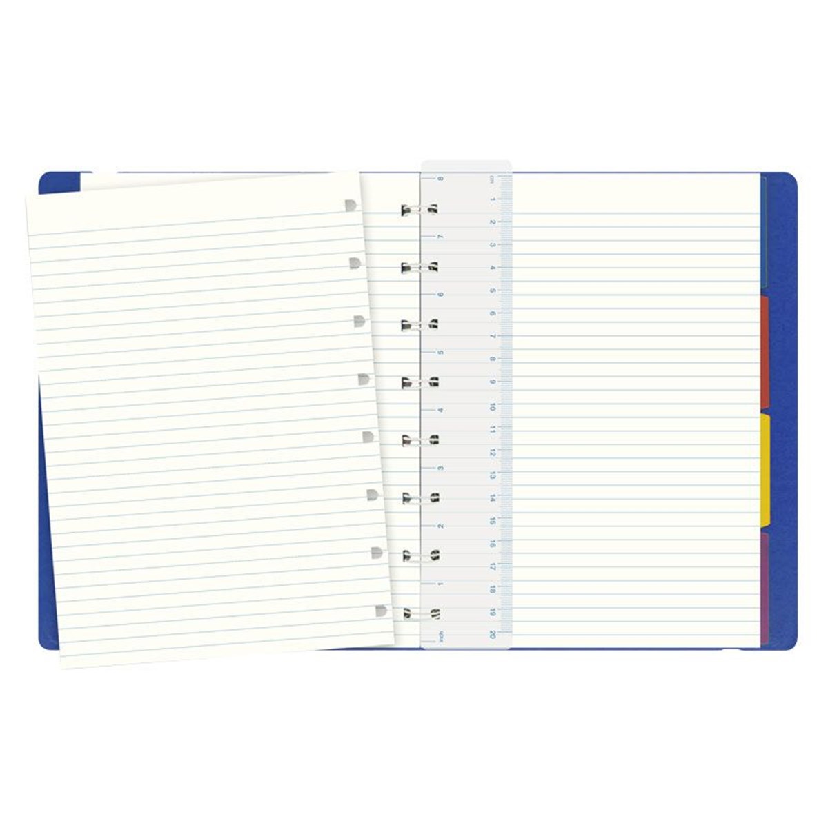 Enkel, smart och personlig anteckningsbok. Omslag i läderliknande konstmaterial. Konstruktionen är unik och smart och man kan lätt sätta i och flytta anteckningsbladen för maximal flexibilitet. Ligger helt platt när den är uppslagen. Flyttbart, färgat register och linjal/markör. 100 g papper. 56 linjerade blad.