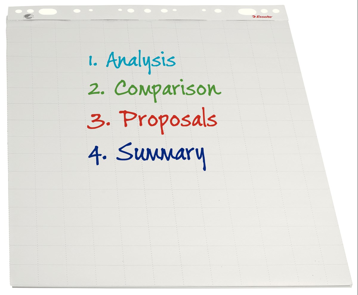 Blädderblock ekonomi, 55x71 cm, en sida med rutnät (framsida) och en sida otryckt (baksida), 50 ark 60 g/m2 TMP papper. Perforerat papper och universellt upphängningssystem.