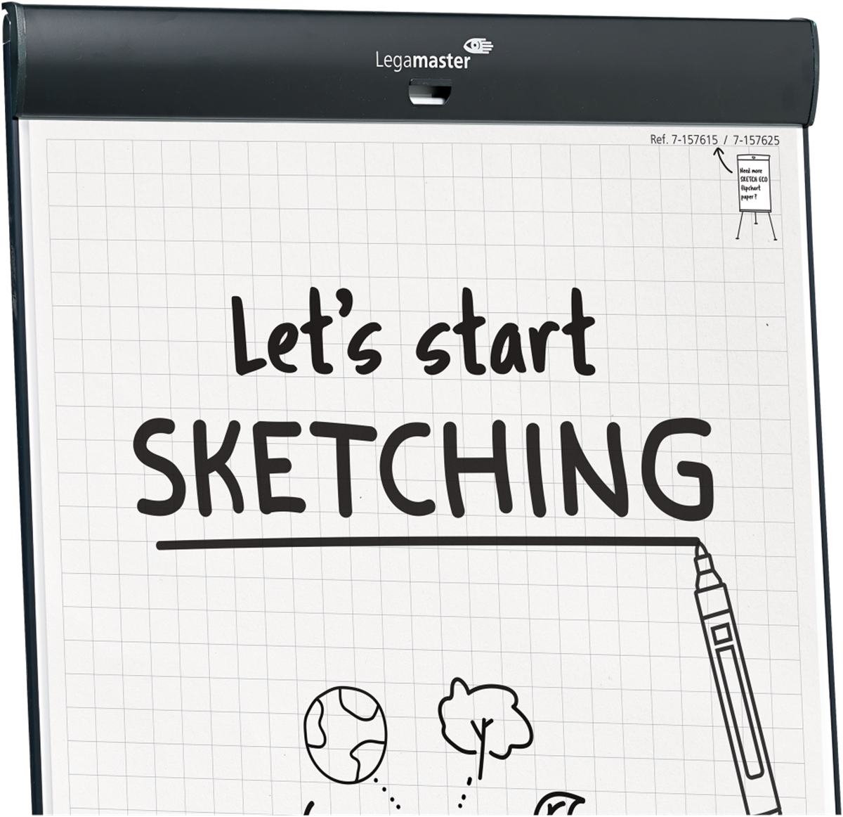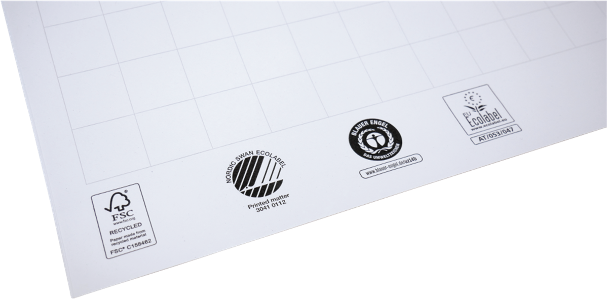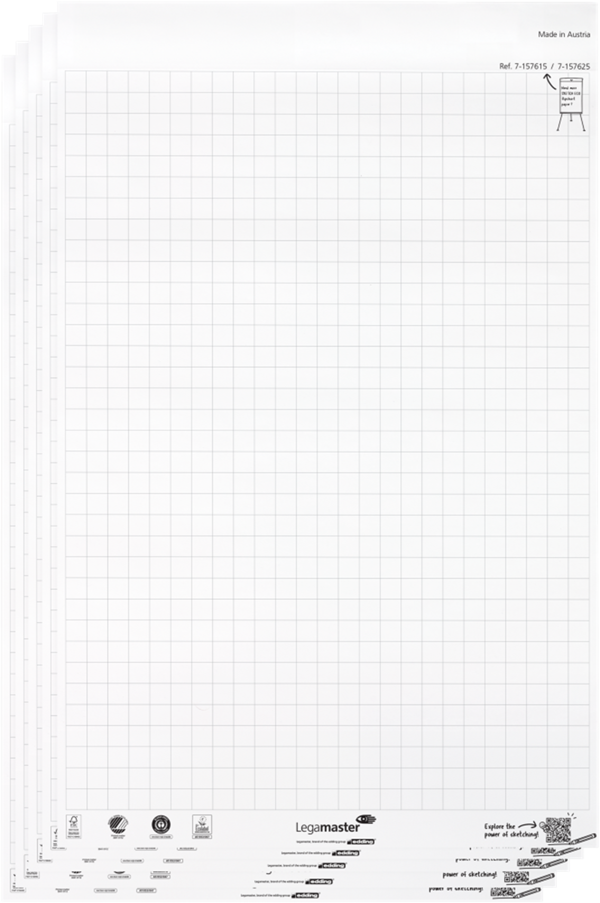 Blädderblock med 20 ark/block, tillverkade av klorfritt blekt och återvinningsbart papper. Varje ark har universell 6-hålsperforering samt mikroperforering i toppen för enkel avrivning. Mått: 98 × 65 cm. Pappersvikt: 80 g. Rutnät: 2,5 × 2,5 cm. 2 st Edding 31 EcoLine blädderblockspennor medföljer.
