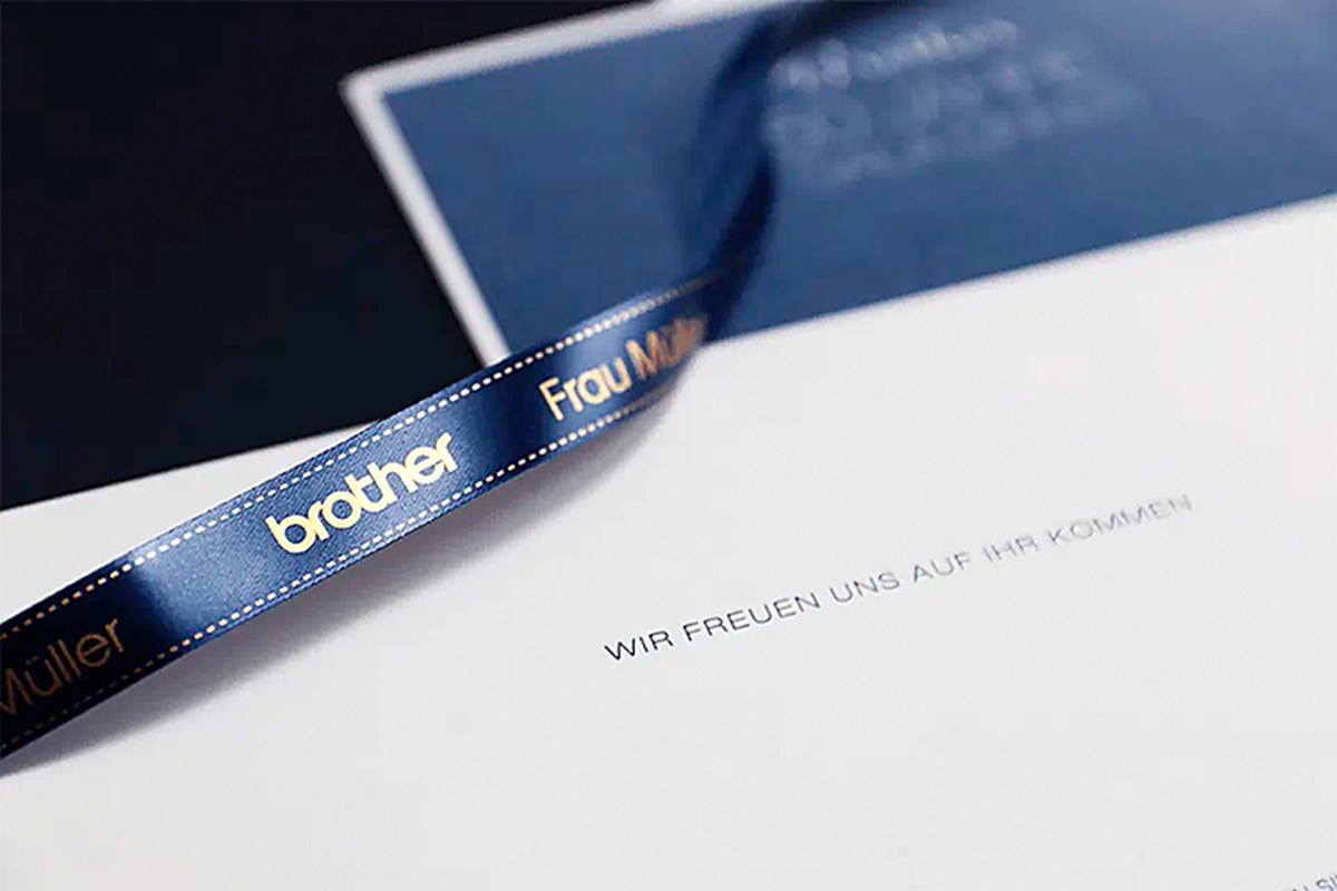 Lägg till en personlig touch på kort och presenter med Brother TZe-RN34 satinband med guld på marinblå botten. Oavsett om det är ett speciellt tillfälle, eller om du bara vill göra något extra fint är det här lyxiga satinbandet ett perfekt sätt att göra gåvor mer personliga.