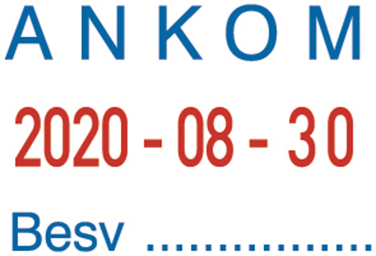 Stativ av metall med datum och utbytbara texter: ANKOM, BETALD, BOKFÖRD, FAKTURERAD, FAXAD, STANSAD, Besv...
