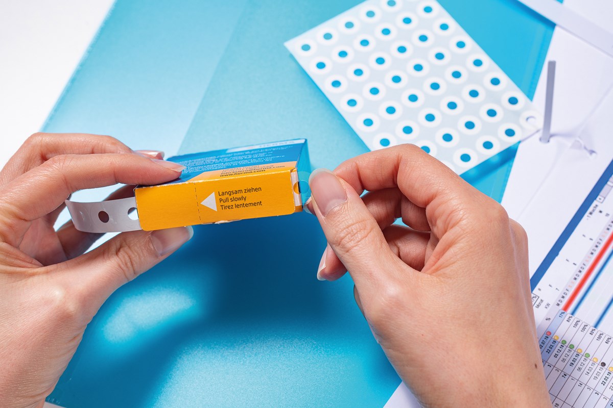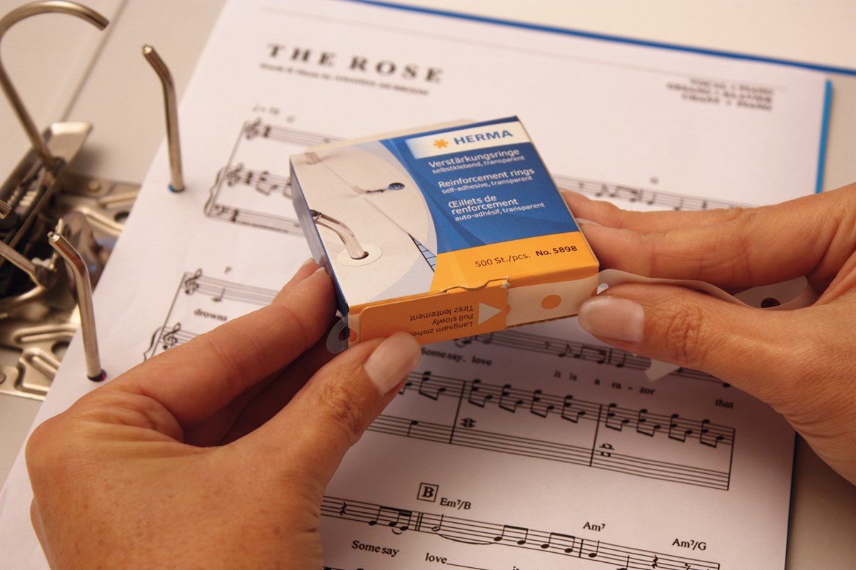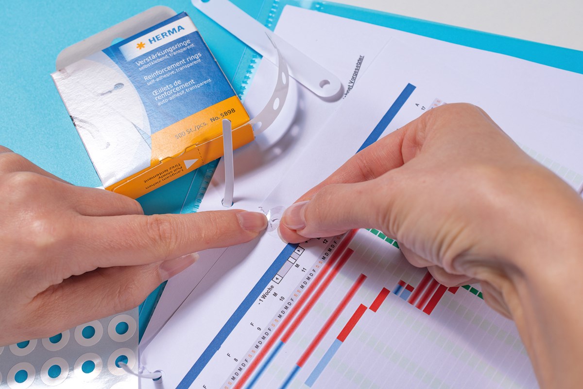 Skyddar hålslagna handlingar mot förslitning. Självhäftande. Tillverkade i PP. 500 st/förp.