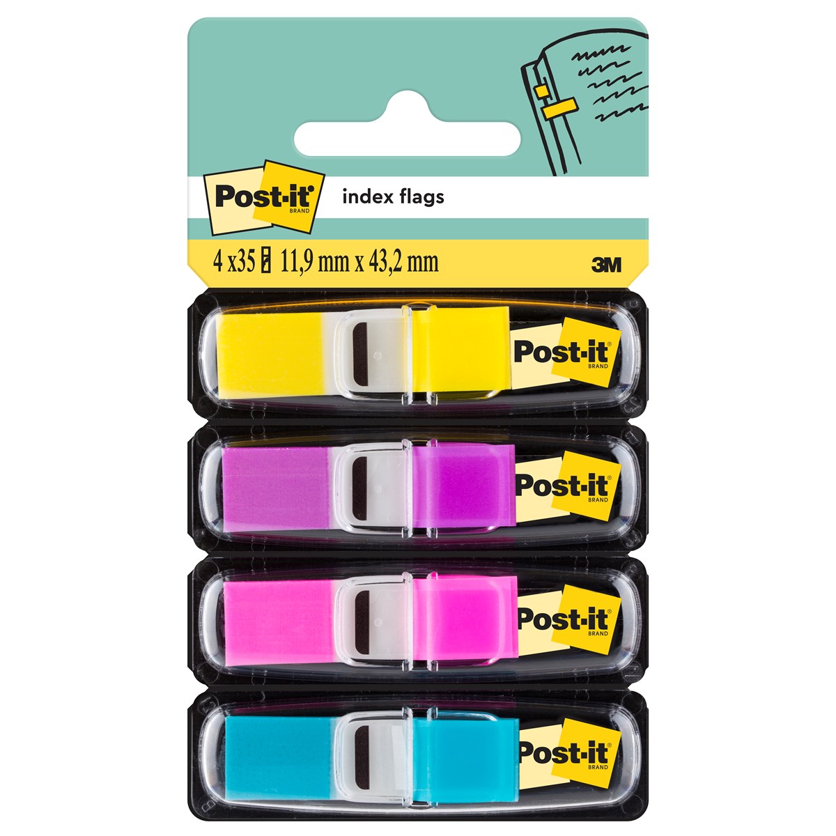 Post-it® Indexflikar gör det enkelt att markera eller flagga viktig information. De fäster säkert, avlägsnas enkelt och finns i fyra olika färger. Rikta uppmärksamheten mot viktiga objekt eller använd dem för att markera, arkivera eller färgkoda ditt arbete i såväl hemmet som på arbetet eller i klassrummet. Hållaren gör det lätt att dra ut med en hand. Mått: 11,9 x 43,2 mm. 35 flikar/färg.
