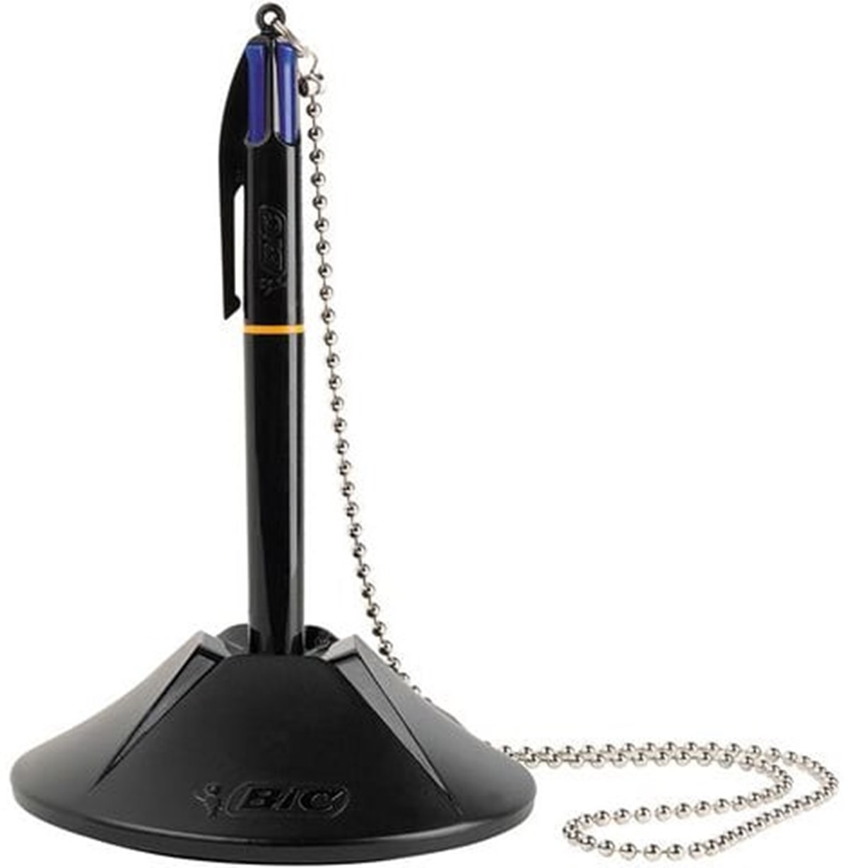 4-färgspenna Bic PRO Counter Pen en snygg svart kulspetspenna särskilt utformad för bord och diskar med en stabil fot, säkerhetskedja, extra vikt och 2 självhäftande halkskydd. Den passar bra expelvis i receptioner, perfekt för att fylla i officiella handlingar. Pennan levereras med 4 blå patorner som är utbytbara. 1,0 mm stift, skrivbredd 0,32 mm. Skrivlängd 8000 m. Tillverkade av minimalt med råmaterial och miljömärkt med NF Environnement eco-label.