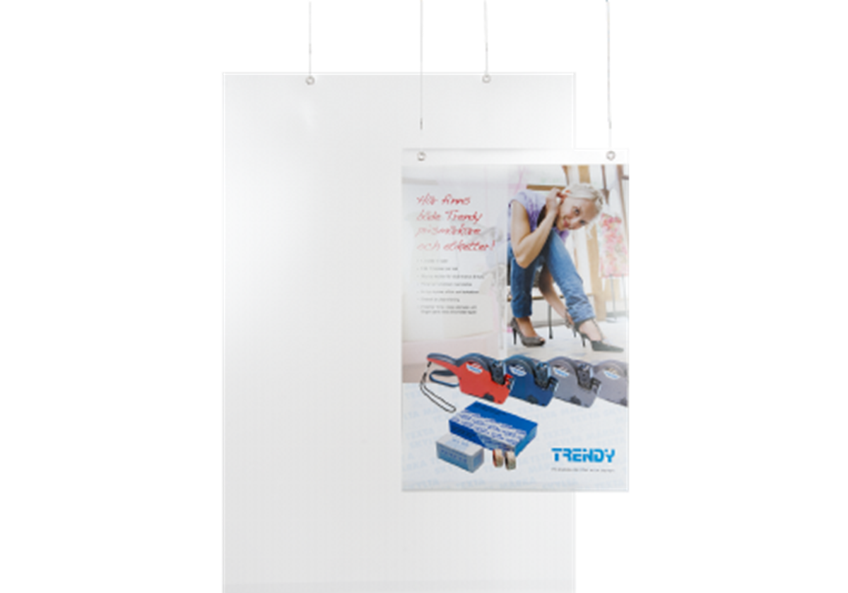 Frihängande plastficka för affischer i A3 format. Plastfickan har öljetter i överkant med cc mått 25cm. Nederkant av fickan har ett uppvik som håller affischen på plats. Tillverkad i antireflex behandlad plast.